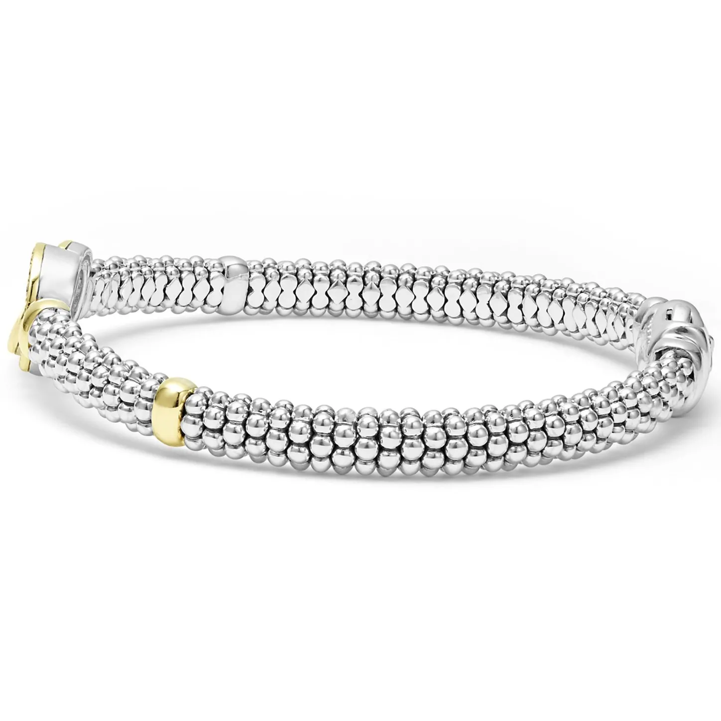 18K Gold, Diamonds, And Sterling Silver Caviar Beading Form This Signature Interlocking Bracelet. Lagos Diamonds Are The Highest Quality Natural Stones.