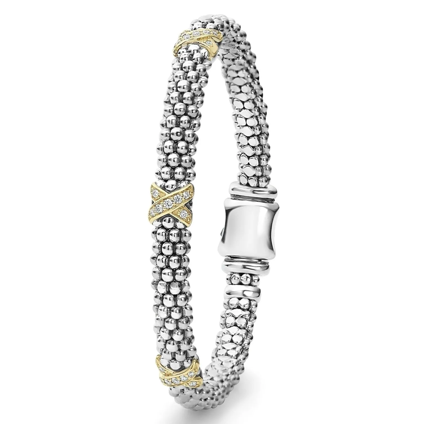 Three Pavé Diamond 18K Gold X Stations Accent This Sterling Silver Caviar Beaded Bracelet. Lagos Diamonds Are The Highest Quality Natural Stones.
