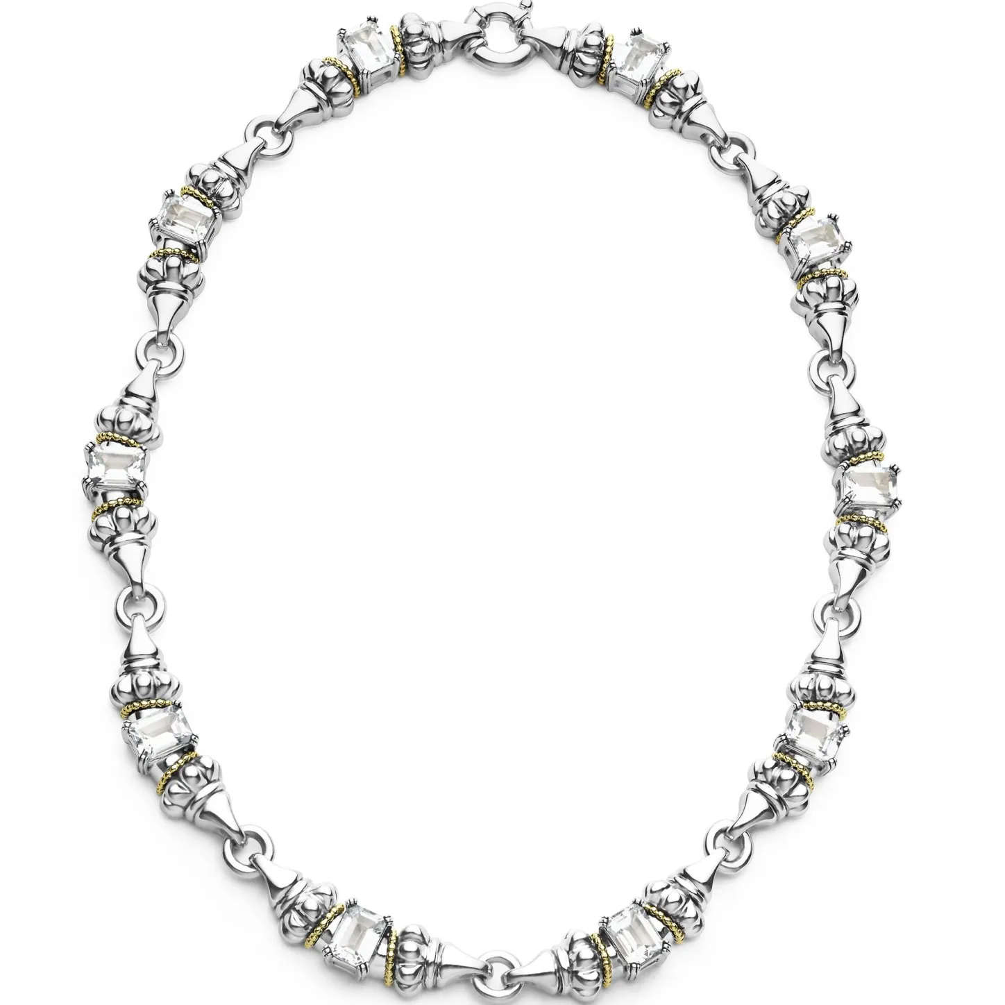Ten Emerald-Cut White Topaz Gemstones With A Prong Setting In Sterling Silver And 18K Gold Caviar Beading Form This Necklace.