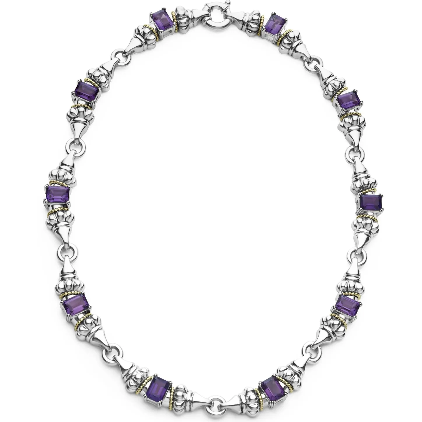 Ten Emerald-Cut Amethyst Gemstones With A Prong Setting In Sterling Silver And 18K Gold Caviar Beading Form This Necklace.