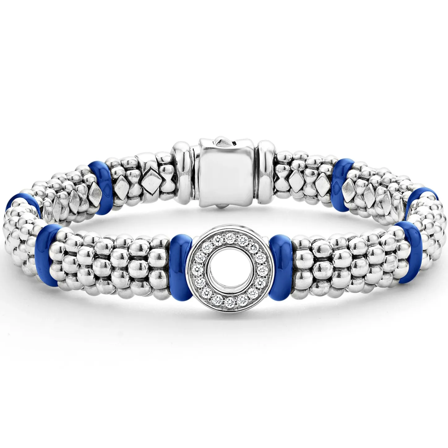- One 9Mm Sterling Silver Caviar Bracelet With Ultramarine Ceramic Stations & Diamonds In A Circle Motif. Set Includes Size Medium.