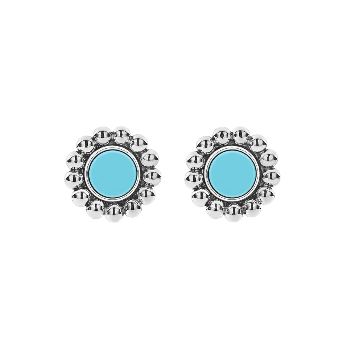 Blue Ceramic Circle Earrings Framed By Sterling Silver Caviar Beading.