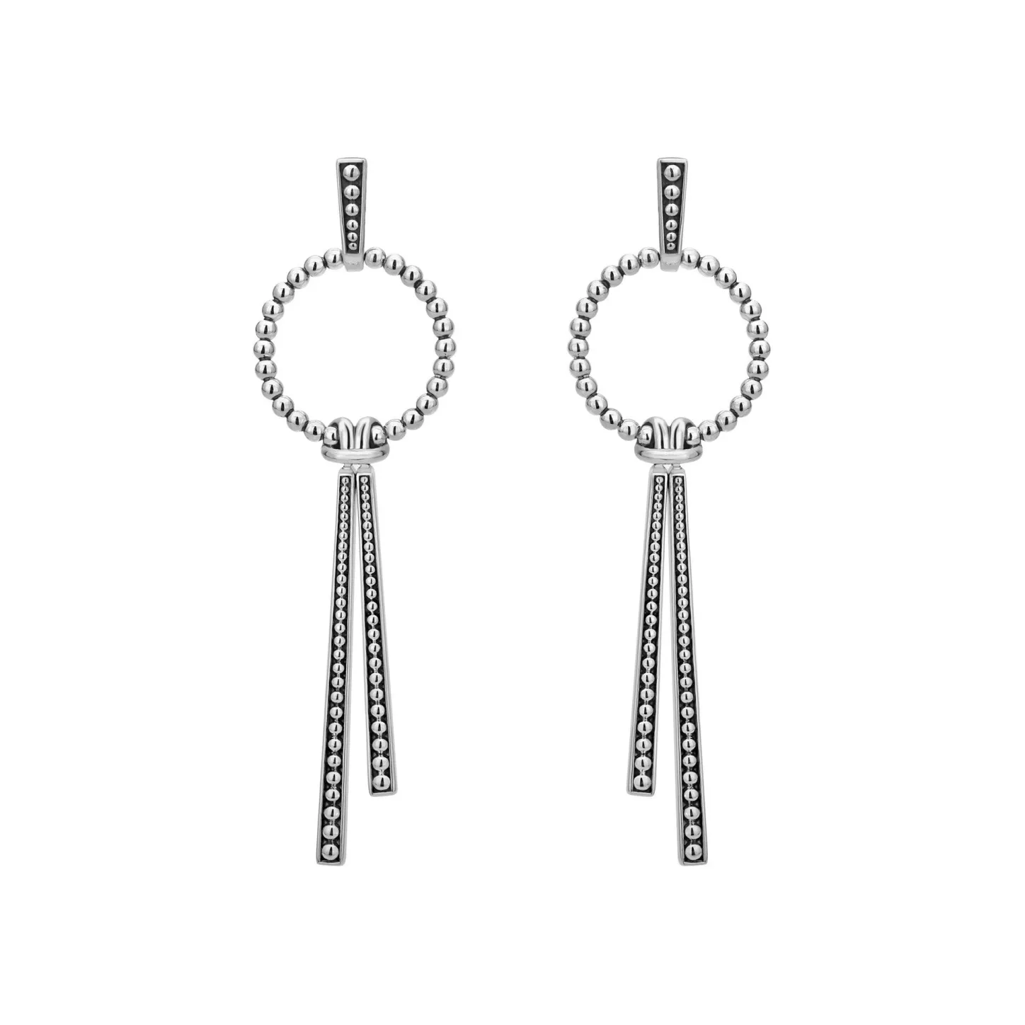 Sterling Silver Circle Drop Earrings With Two Hanging Caviar Beaded Stations.