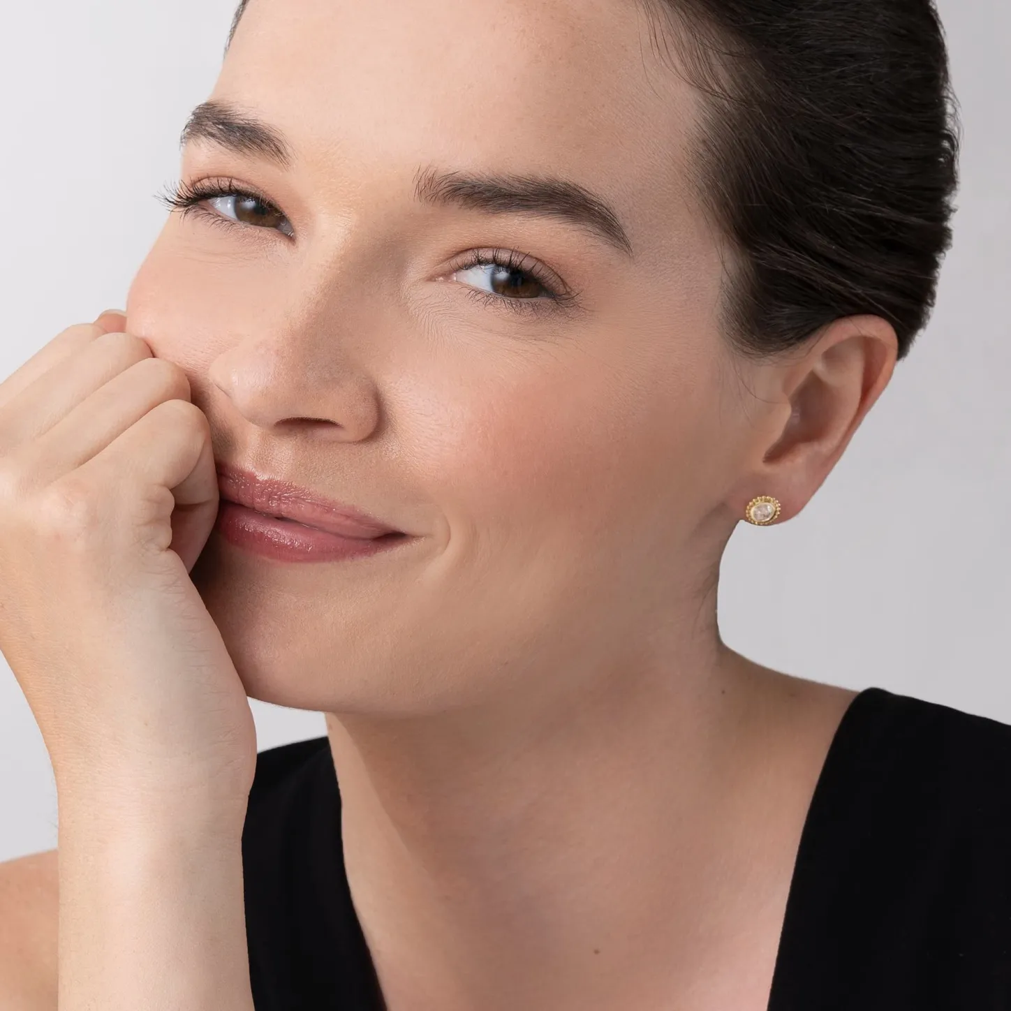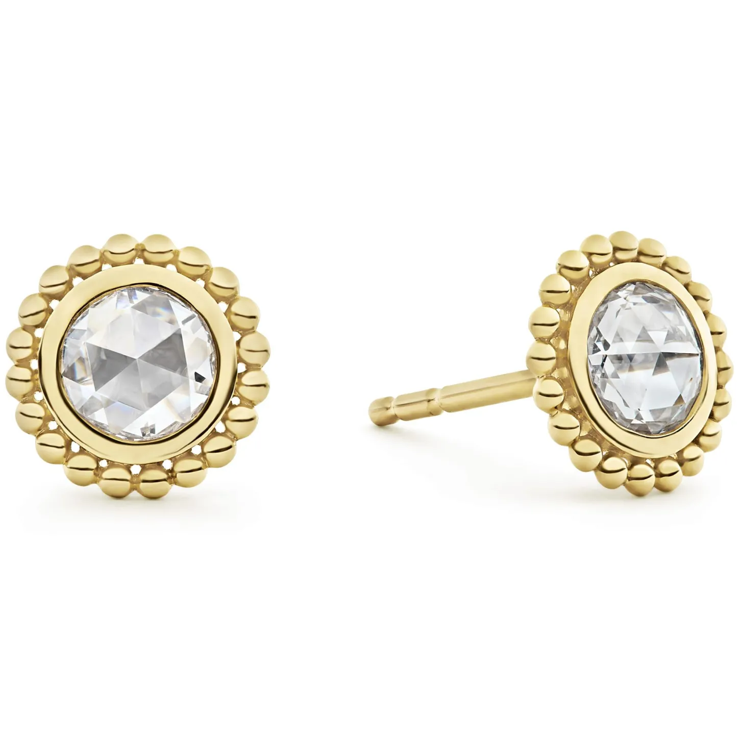 Rose Cut Diamond Stud Earrings Set And Surrounded By 18K Gold Caviar Beading. Lagos Diamonds Are The Highest Quality Natural Stones.