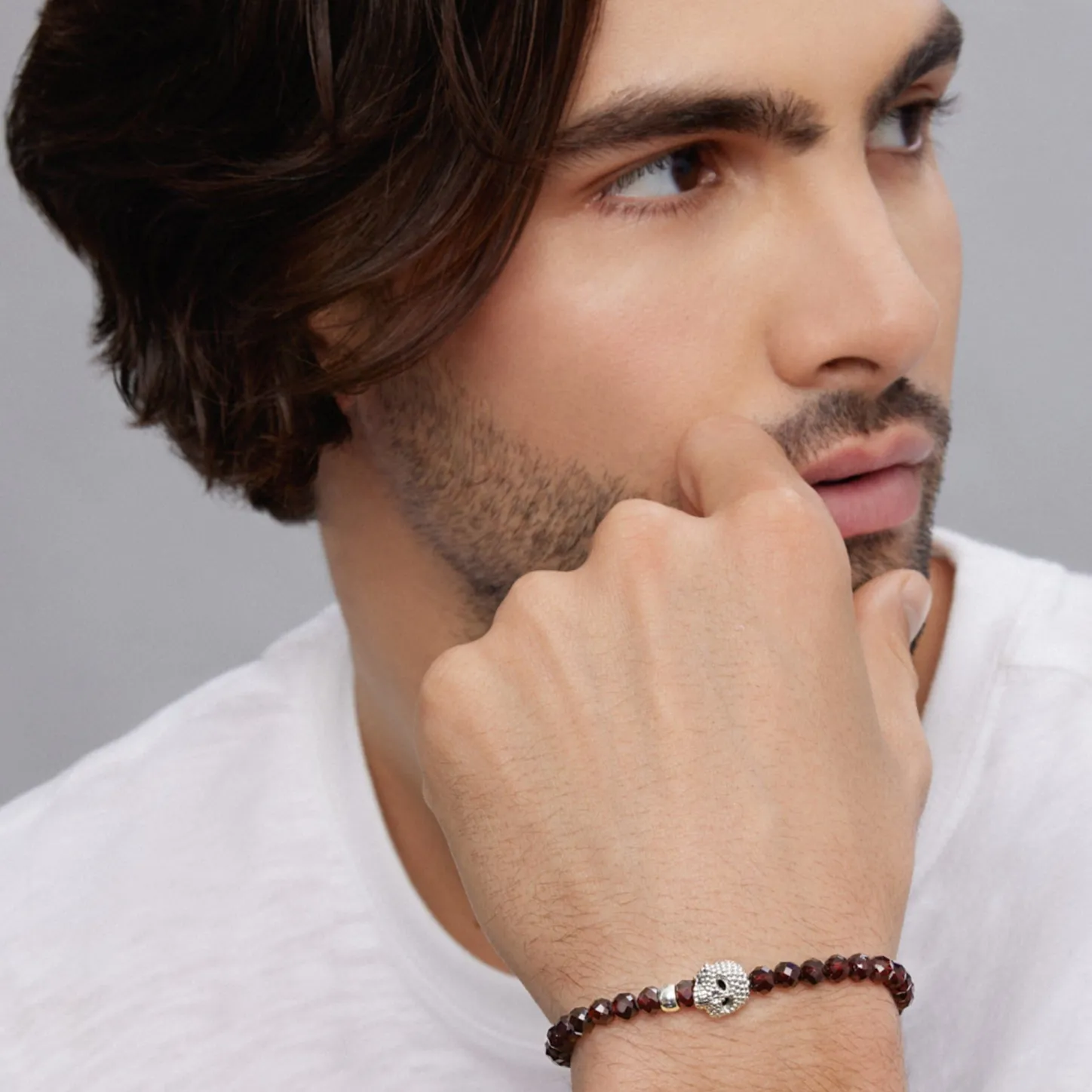 Red Garnet Gemstone Bracelet With A Sterling Silver Caviar Skull. The Stretch Fit Accommodates Most Wrist Sizes.