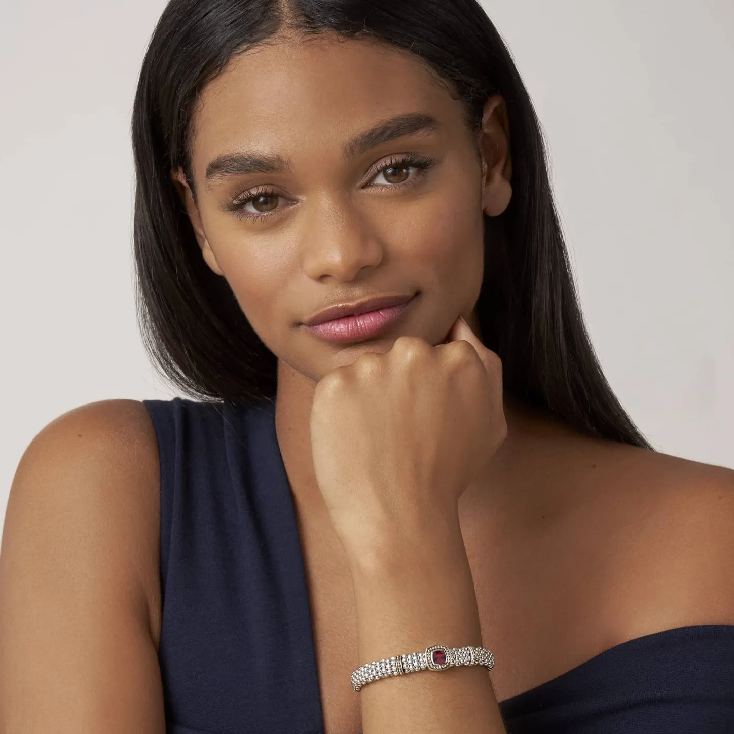 A Rhodolite Garnet Gemstone And Sterling Silver Caviar Beading With 18K Gold Detailing Forms This Bracelet.