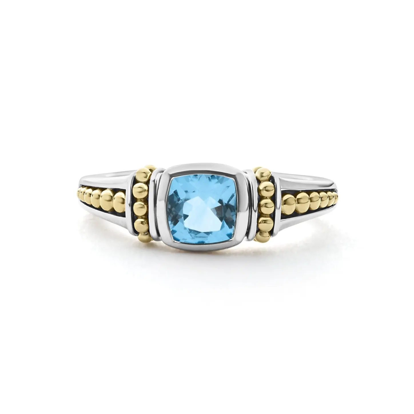 Swiss Blue Topaz Gemstone Ring Surrounded By Sterling Silver And 18K Gold Caviar Beading.
