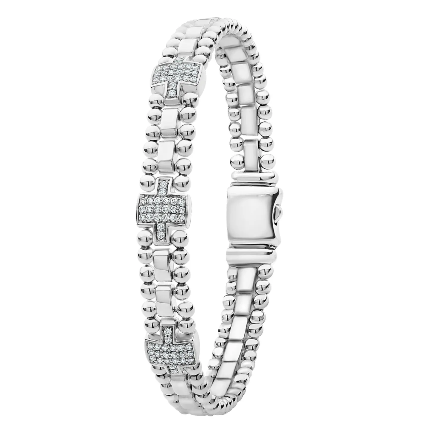 Three Pavé Diamond Stations Set By Sterling Silver Caviar Beading Form This Signature Link Bracelet. Lagos Diamonds Are The Highest Quality Natural Stones.
