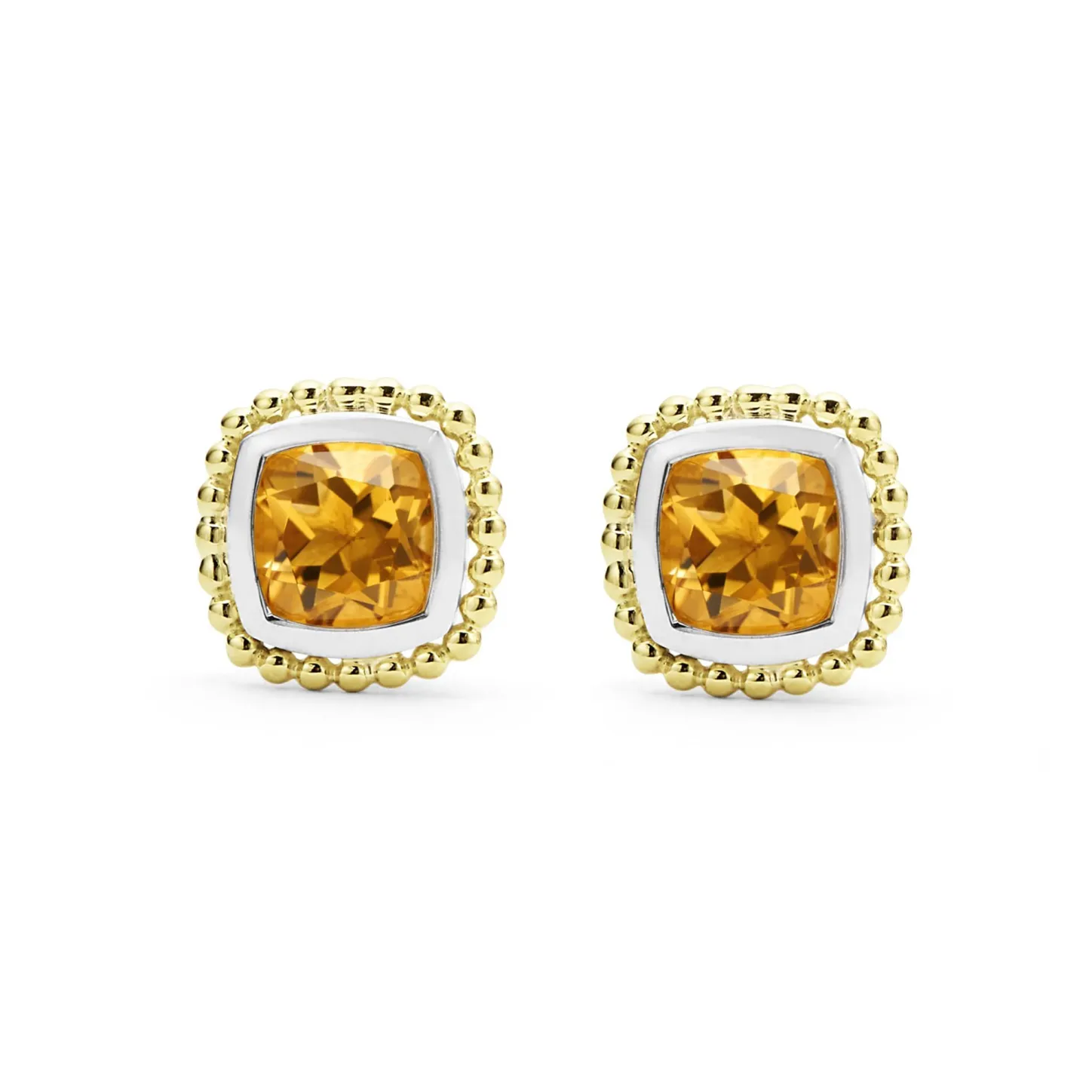Citrine Gemstone Stud Earrings Surrounded By Smooth Sterling Silver And 18K Gold Caviar Beading.