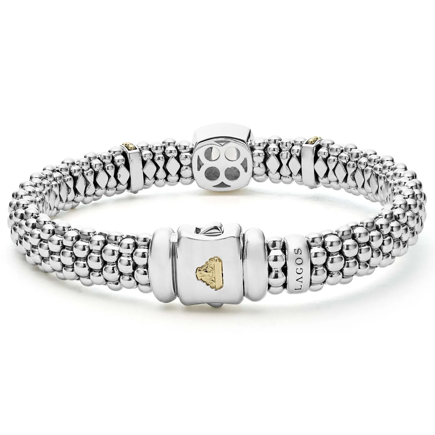 A White Topaz Gemstone And Sterling Silver Caviar Beading With 18K Gold Detailing Forms This Bracelet.