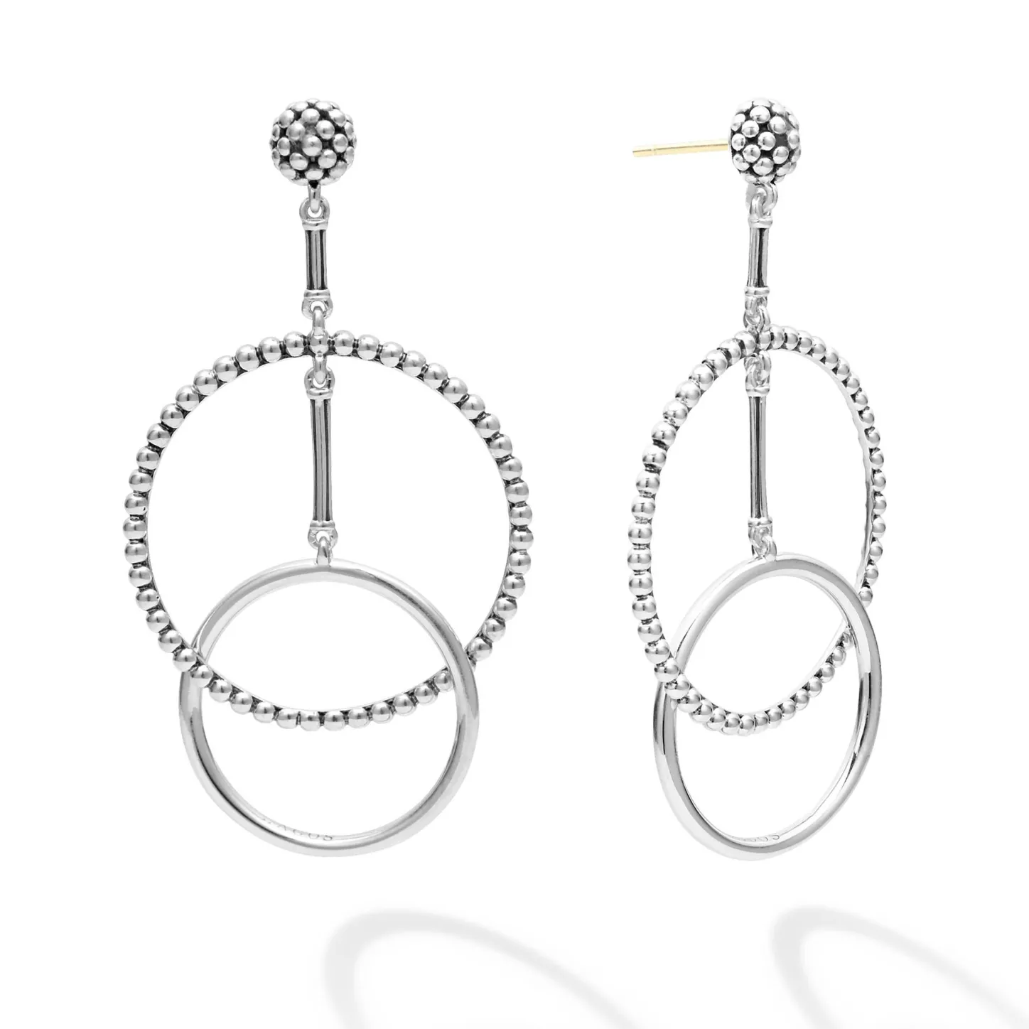 Sterling Silver High Low Circle Drop Earrings Accented With Beautiful Caviar Beading.