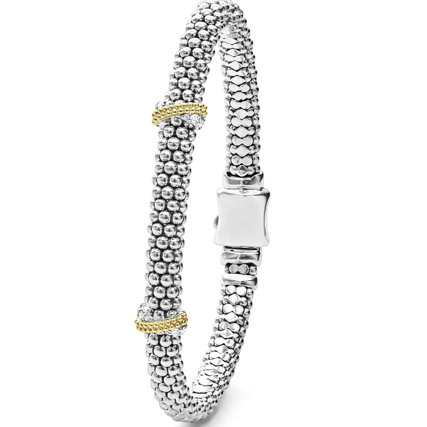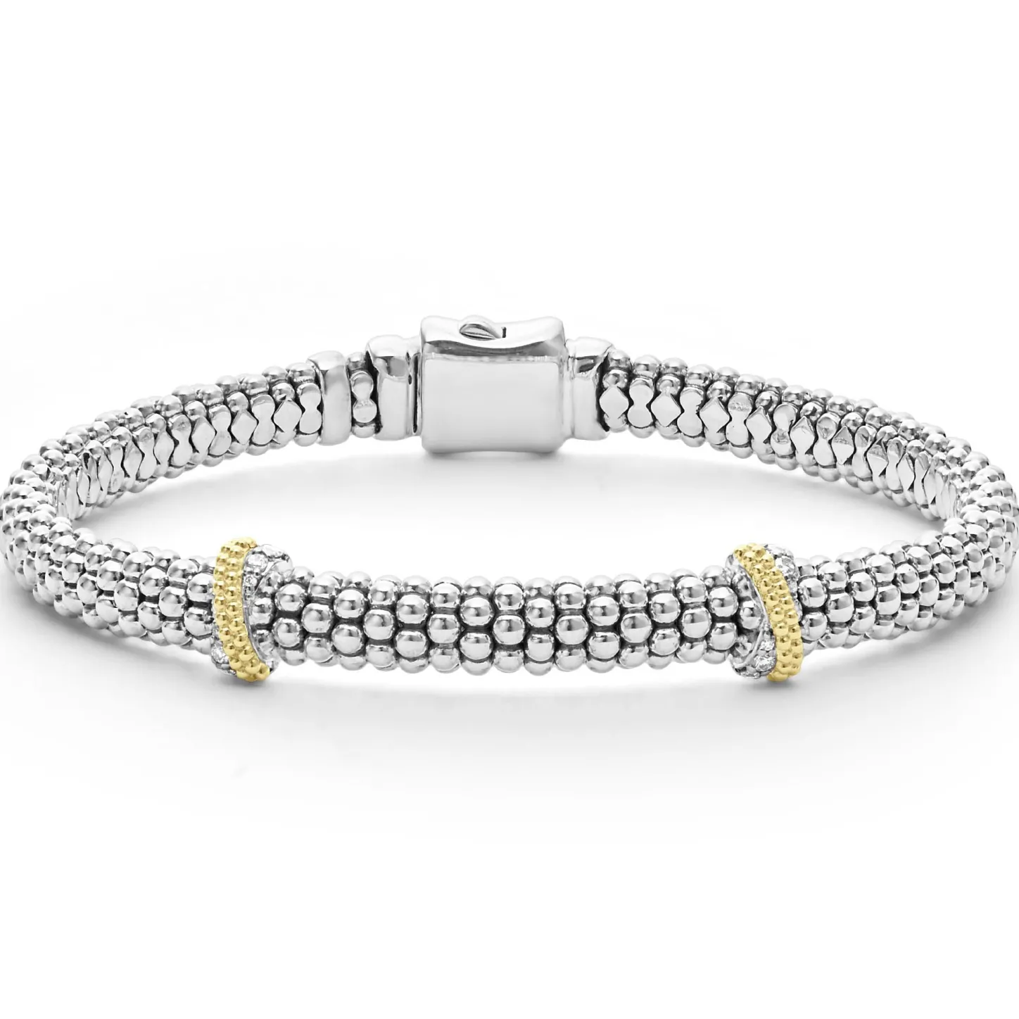 Sterling Silver Caviar Beading Accented By Two 18K Gold And Diamond Stations Form This Detailed Lagos Bracelet. Lagos Diamonds Are The Highest Quality Natural Stones.