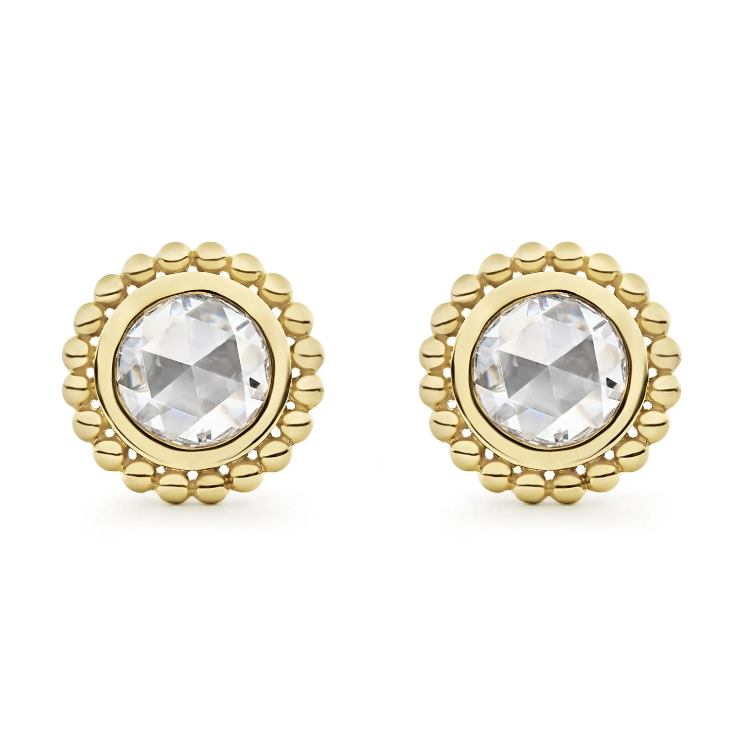 Rose Cut Diamond Stud Earrings Set And Surrounded By 18K Gold Caviar Beading. Lagos Diamonds Are The Highest Quality Natural Stones.