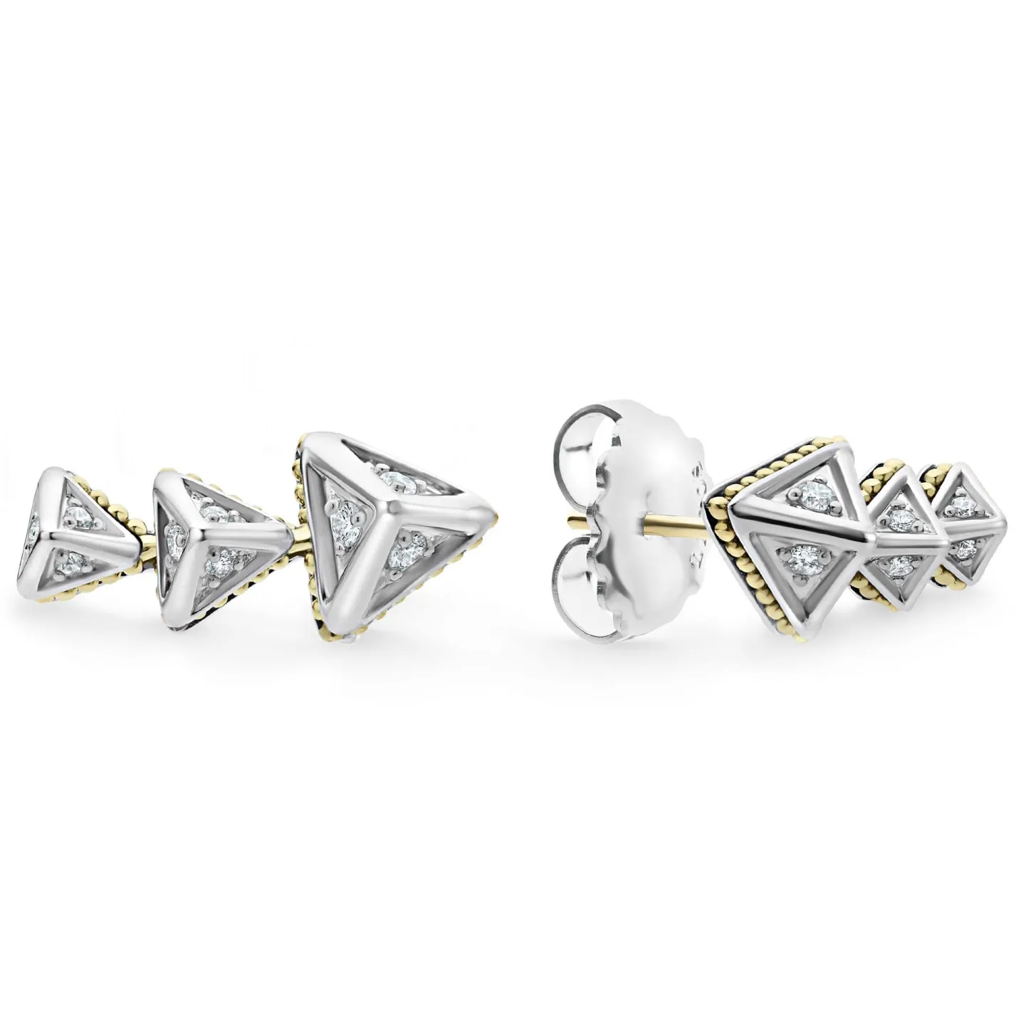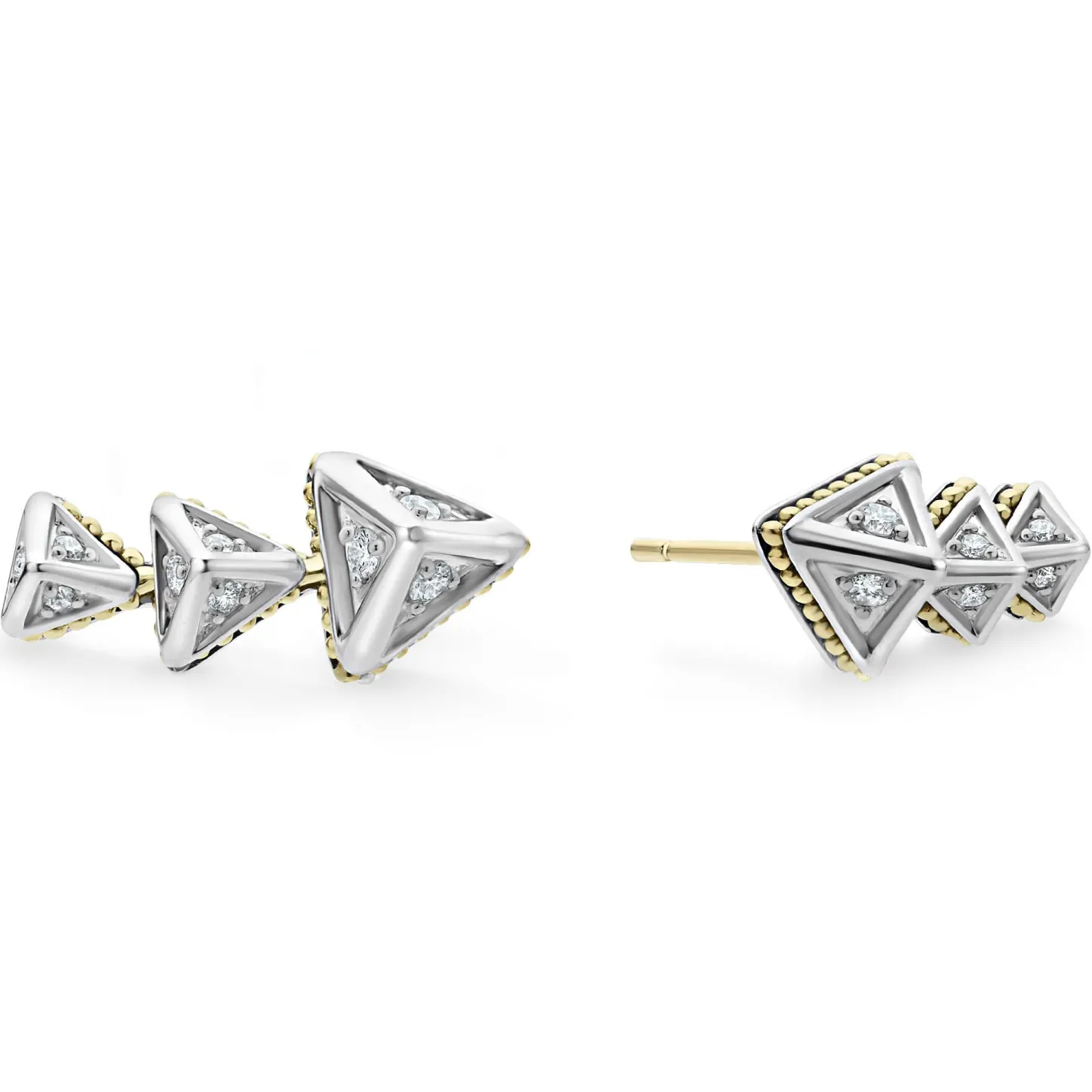 Three Diamond Pyramids Form This Crawler Earring Accented By 18K Gold Caviar Beading. Lagos Diamonds Are The Highest Quality Natural Stones.