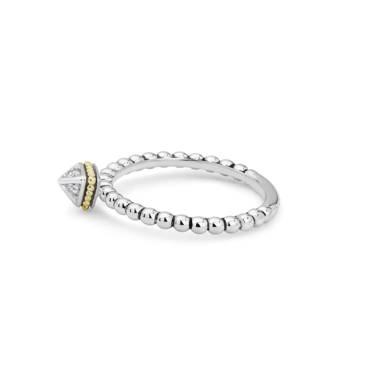 Diamonds Form A Small Pyramid With 18K Gold Caviar Beading On This Sterling Silver Ring. Lagos Diamonds Are The Highest Quality Natural Stones.