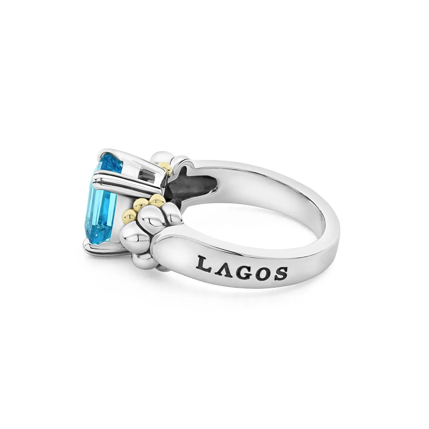 The Return Of A Lagos Icon. Our Signature Emerald-Cut Swiss Blue Topaz Gemstone Ring With A Prong Setting In Sterling Silver And 18K Gold Caviar Beading.