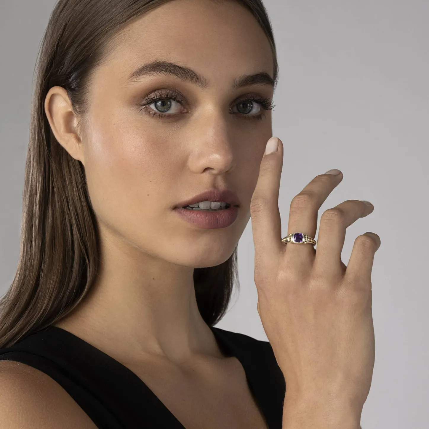 A Lagos Exclusive. Amethyst Gemstone Ring Surrounded By Sterling Silver And 18K Gold Caviar Beading.