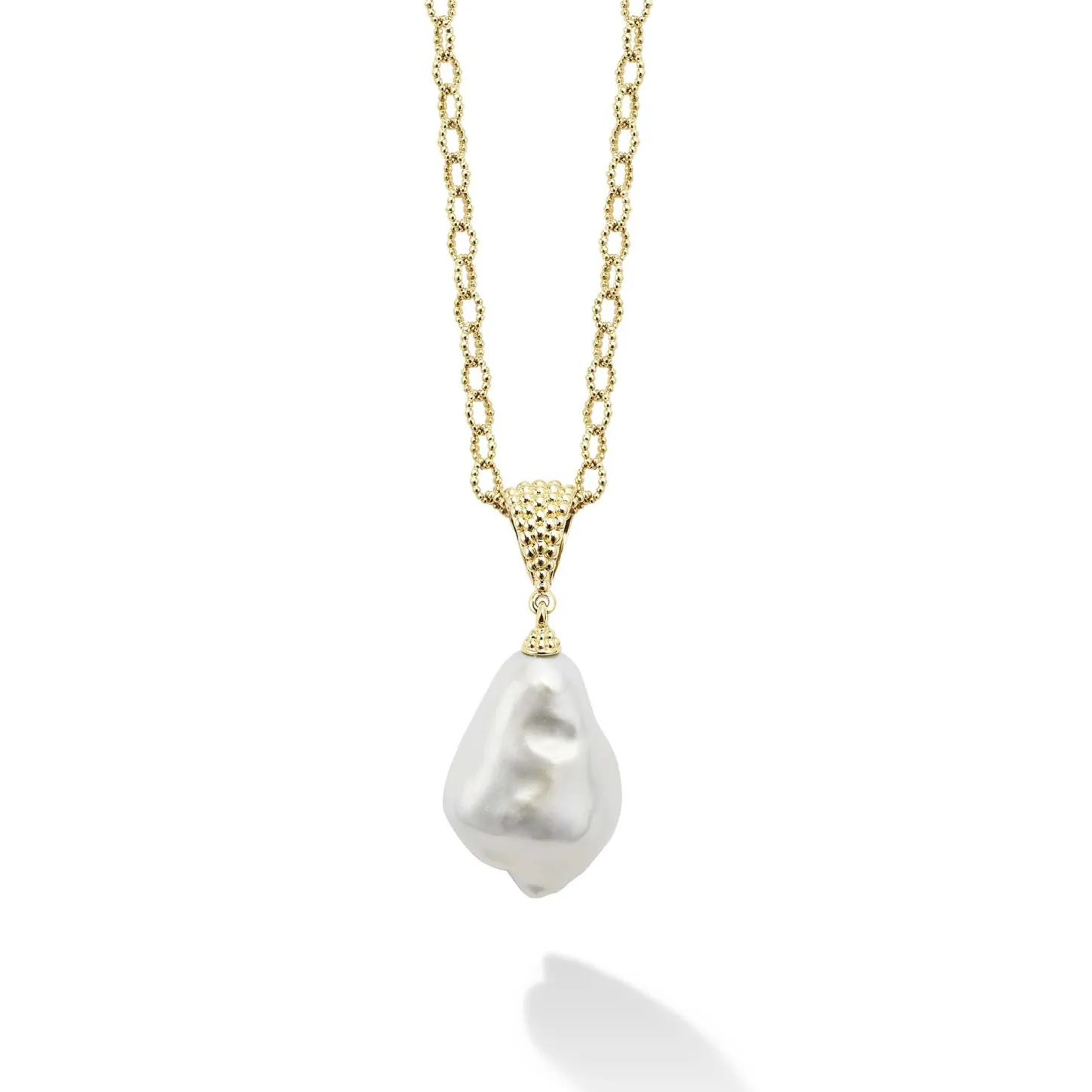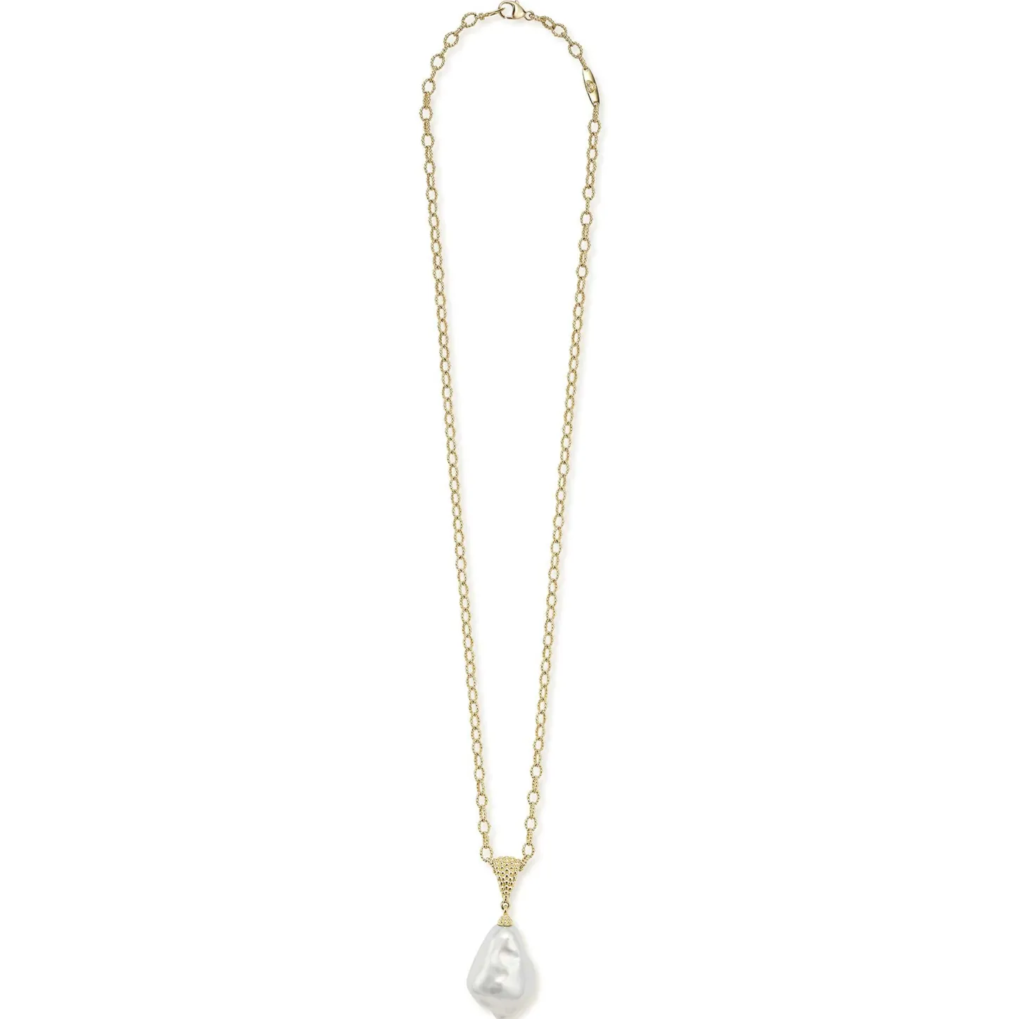 A Timeless Cultured Freshwater Baroque Pearl Pendant Finished On An 18K Gold Link Necklace.