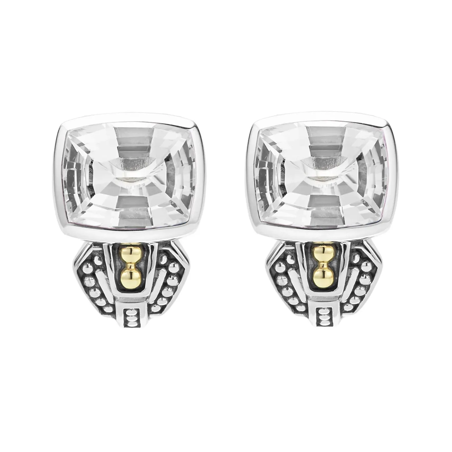 White Topaz Bezel-Set Gemstone Earrings With 18K Gold And Sterling Silver Caviar Beaded Accents.