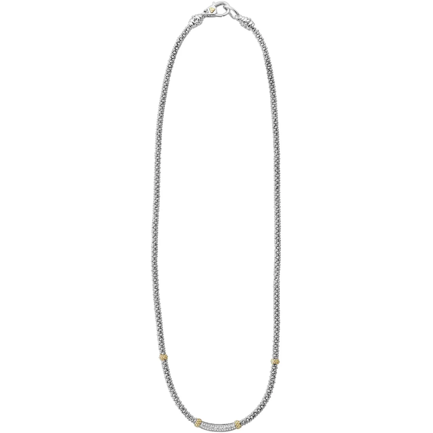 A Pave Diamond Station Accented By 18K Gold Forms This Sterling Silver Caviar Beaded Necklace. Lagos Diamonds Are The Highest Quality Natural Stones.