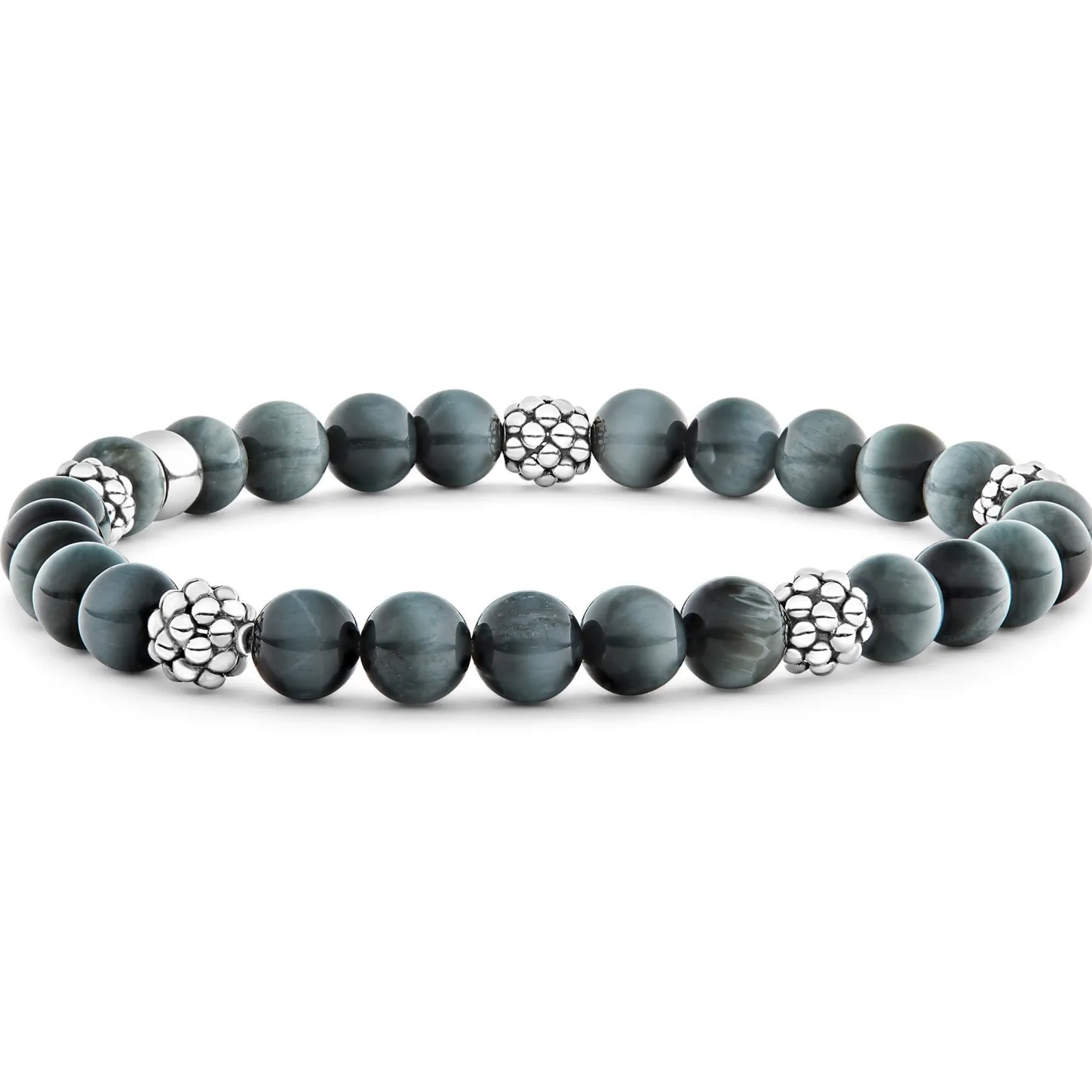 A Silver Eagle Eye Gemstone Bracelet With Five Sterling Silver Caviar Beaded Stations.