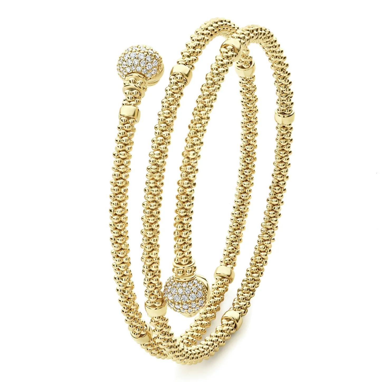 An 18K Gold Caviar Beaded Coil Bracelet With Smooth Stations And Brilliant Diamond Endcaps. Lagos Diamonds Are The Highest Quality Natural Stones.