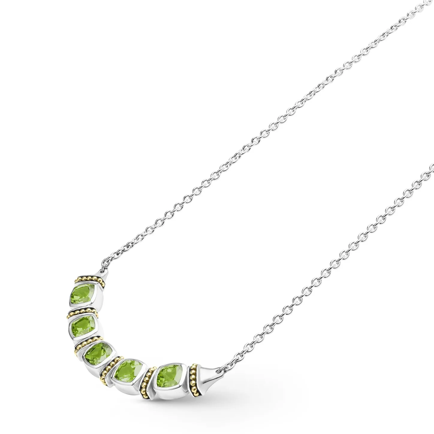 Five Peridot Gemstones Accent This Necklace Surrounded By Sterling Silver And 18K Gold Caviar Beading.