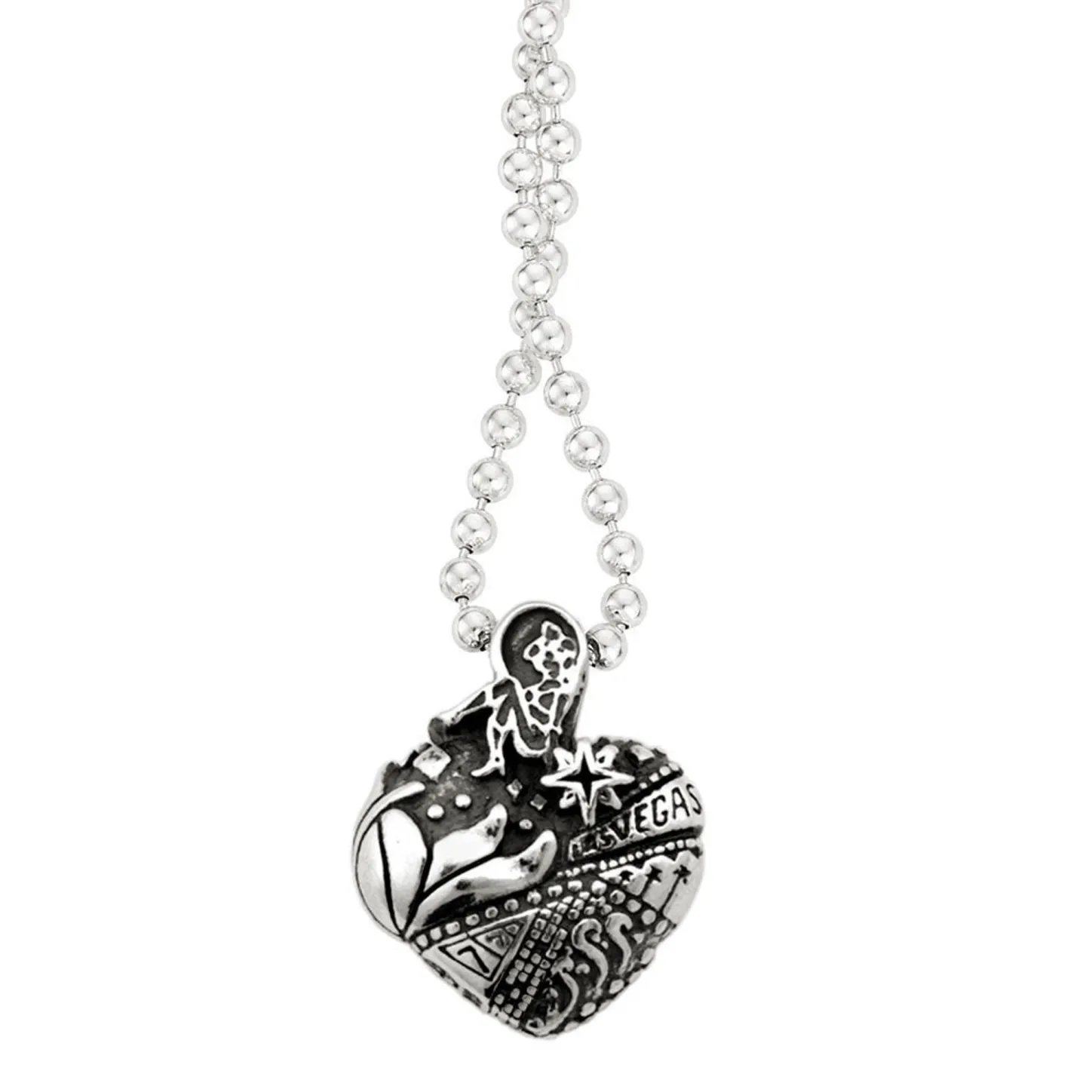 A Sterling Silver Heart Pendant Which Showcases Architectural And Cultural Icons Of Las Vegas Finished On A Ball Chain Necklace.