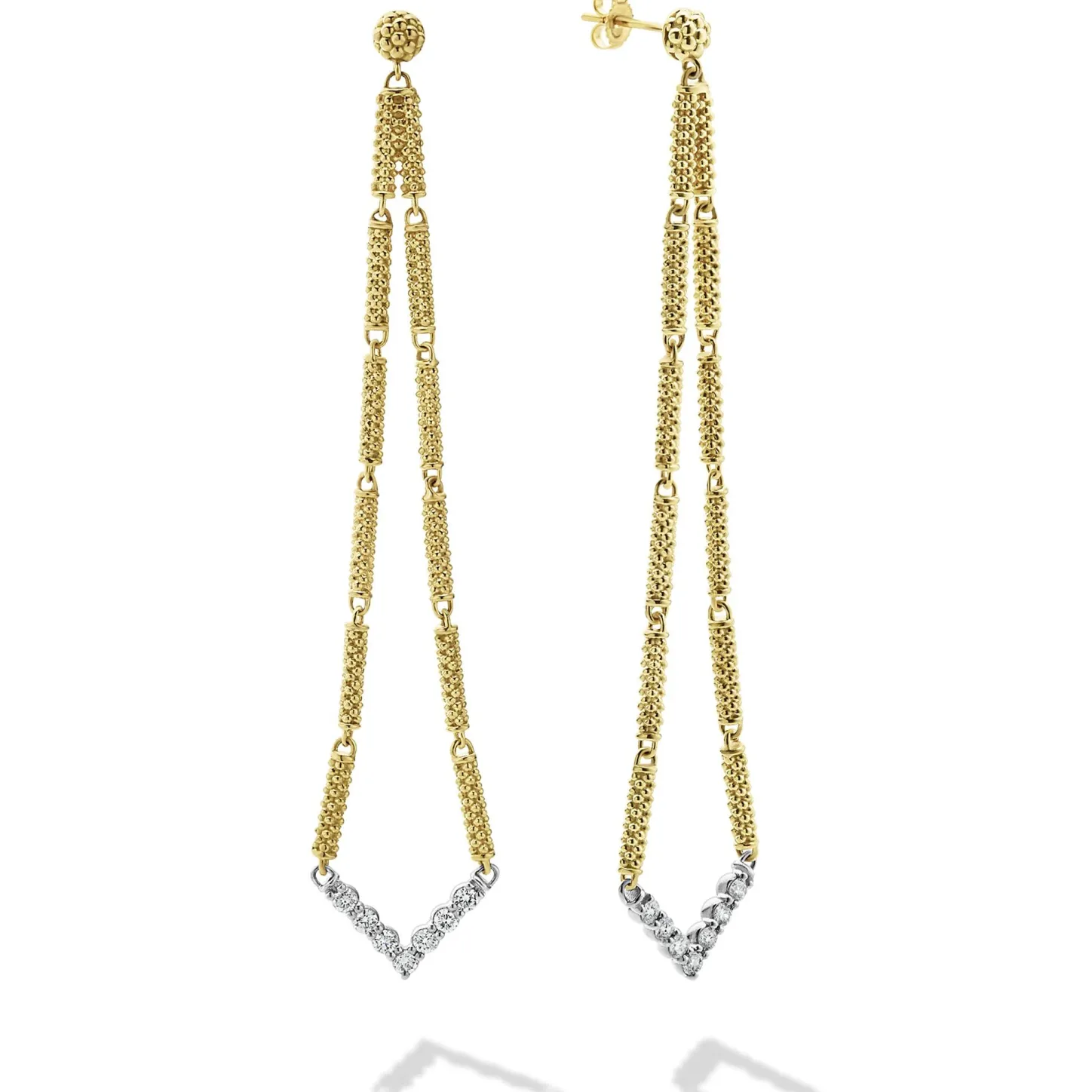 18K Gold Superfine Caviar Beading And Diamonds Set In Chevron Shaped 18K White Gold Form These Dramatic Drop Earrings. Lagos Diamonds Are The Highest Quality Natural Stones.