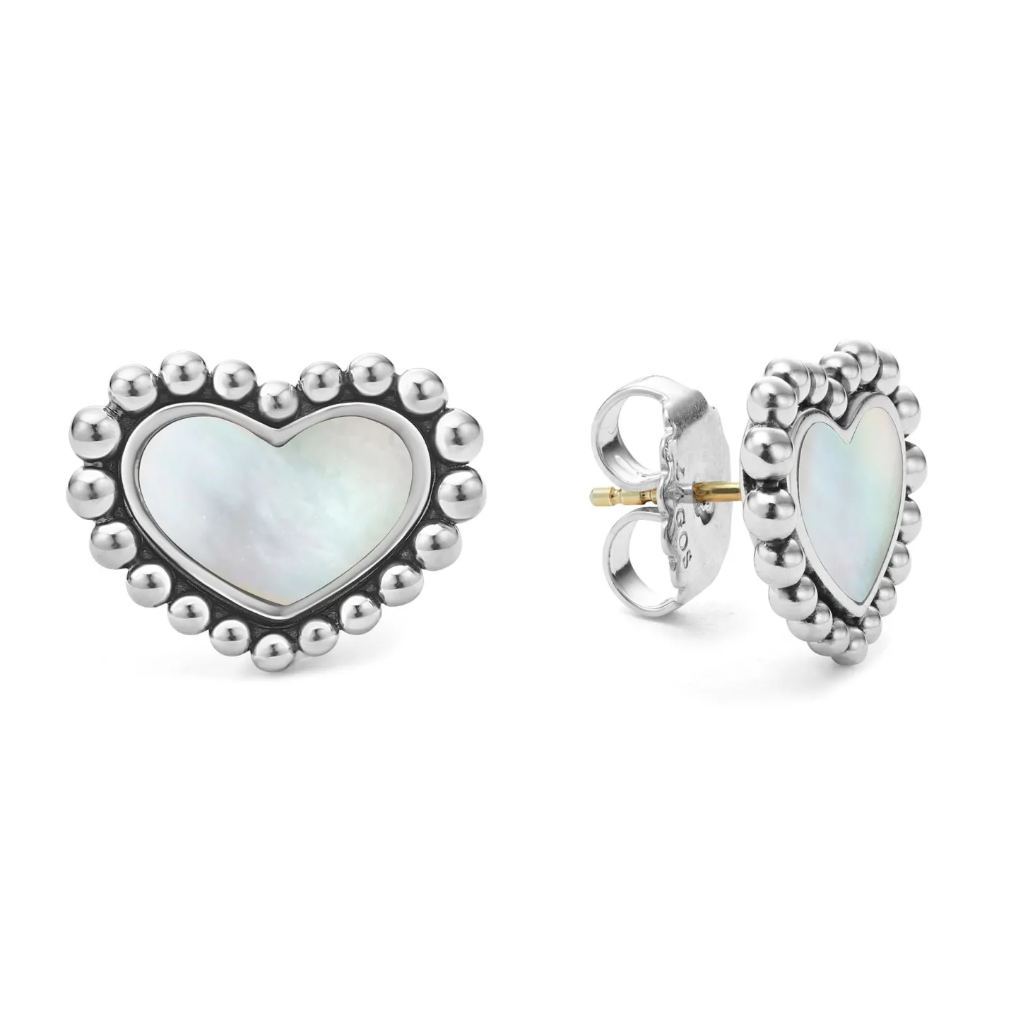 Mother Of Pearl Gemstone Earrings Framed By Caviar Beading In The Shape Of A Heart.
