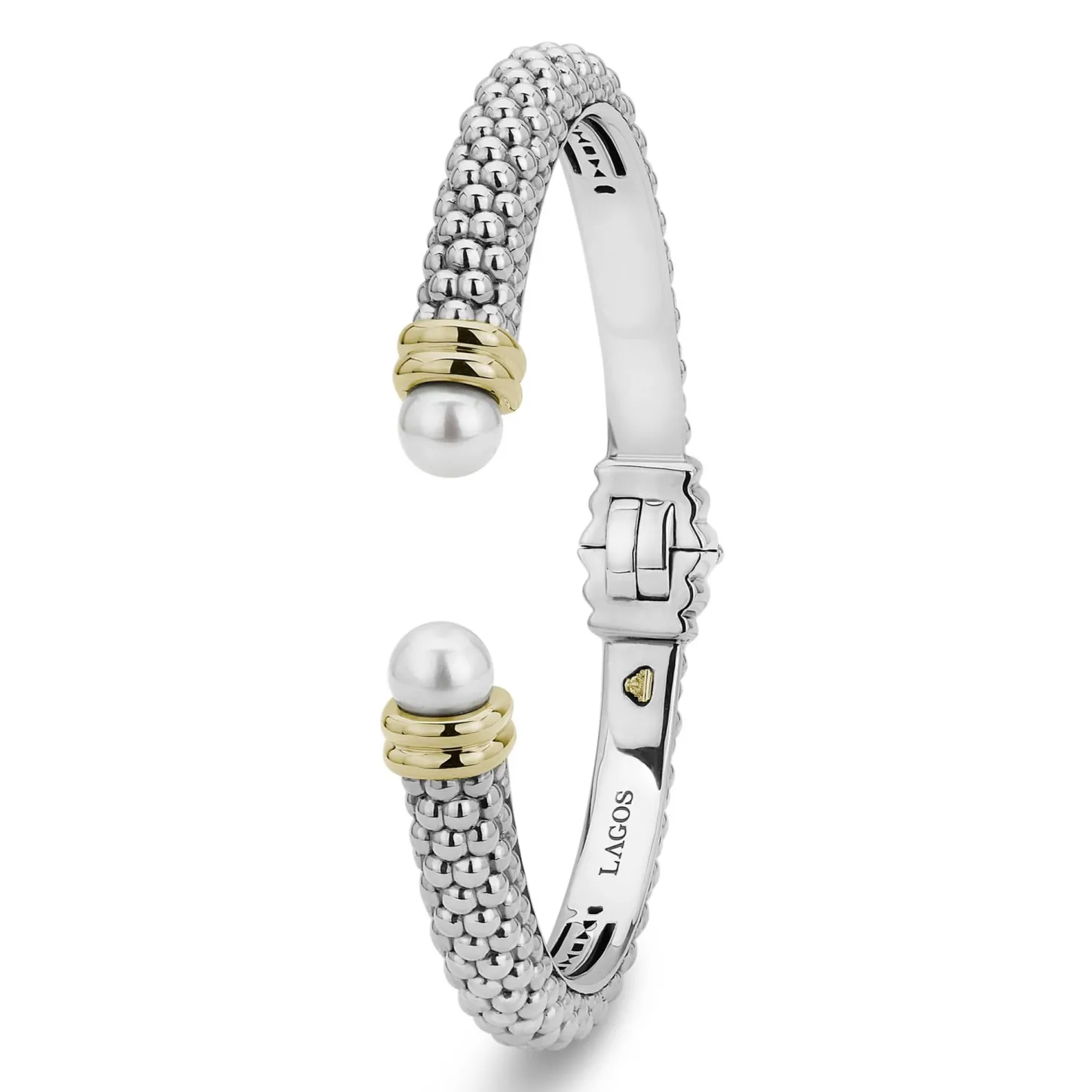 Crafted Sterling Silver Caviar Beading With 18K Gold Forms This Cuff Bracelet Detailing Freshwater Cultured Pearl End Caps.