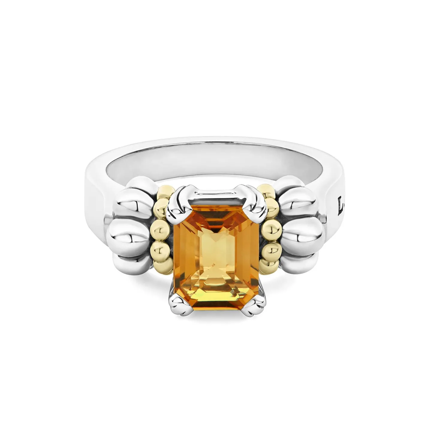 The Return Of A Lagos Icon. Our Signature Emerald-Cut Citrine Gemstone Ring With A Prong Setting In Sterling Silver And 18K Gold Caviar Beading.