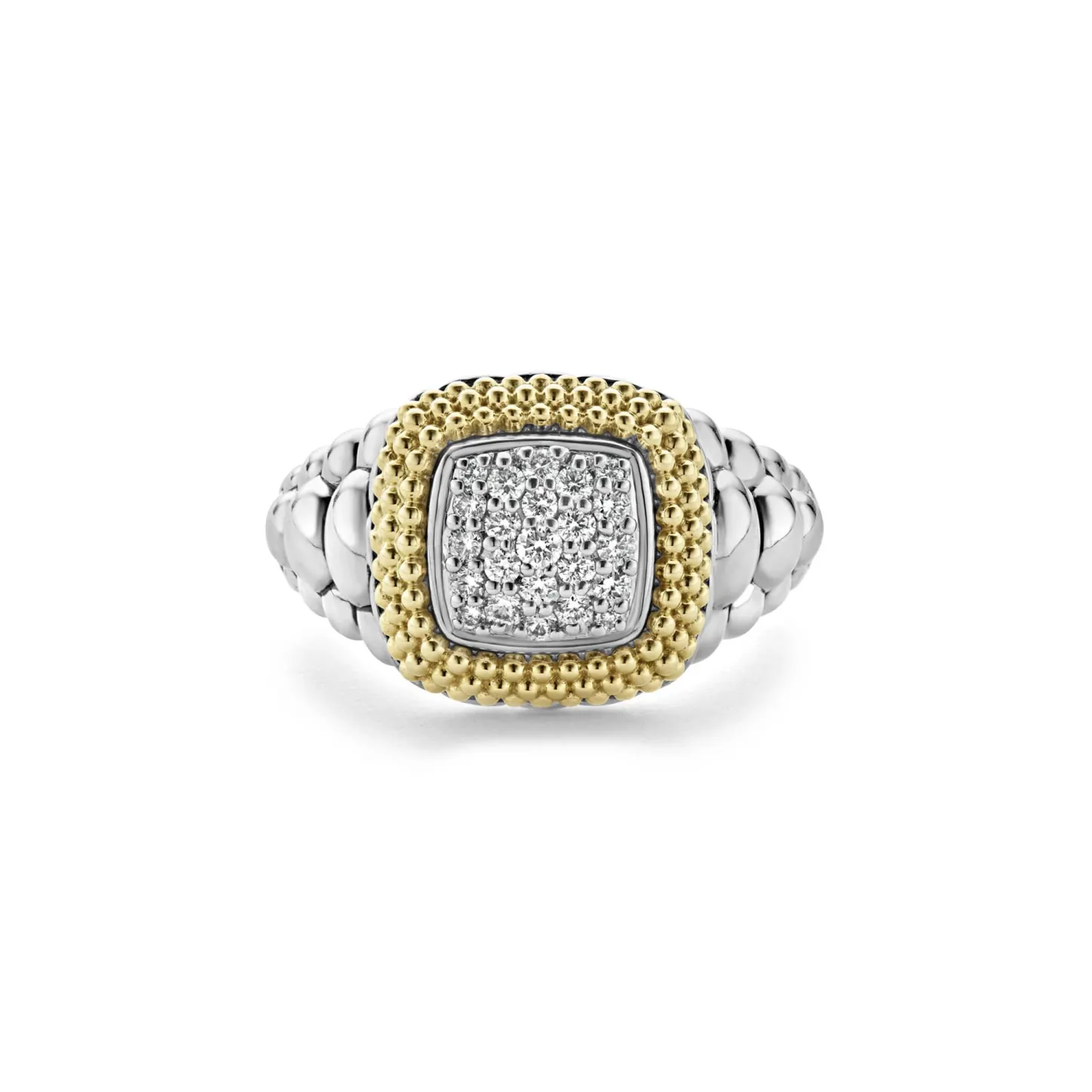 Diamonds And 18K Gold Caviar Beading Form This Statement Ring. Lagos Diamonds Are The Highest Quality Natural Stones.