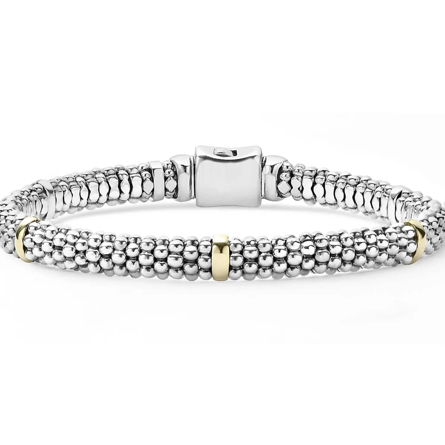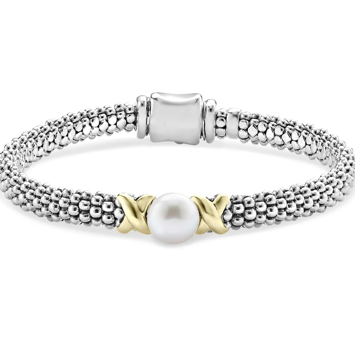 A Lagos Exclusive. Three Classic Bracelets To Layer And Make Your Own. One Stretch Bracelet Made Of Cultured Freshwater Pearls Bracelet. One Classic 6Mm Caviar Bracelet With A Cultured Freshwater Pearl And 18K Gold X Stations. One Classic Sterling Silver And 18K Gold Station 6Mm Caviar Bracelet.