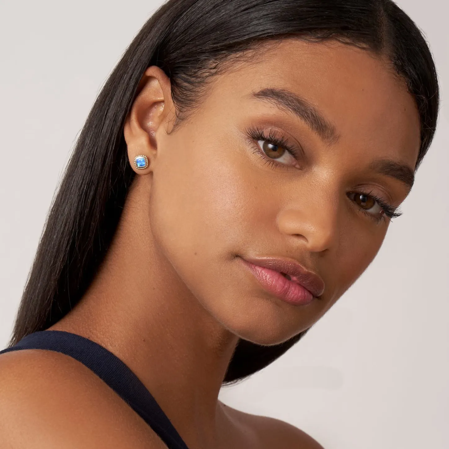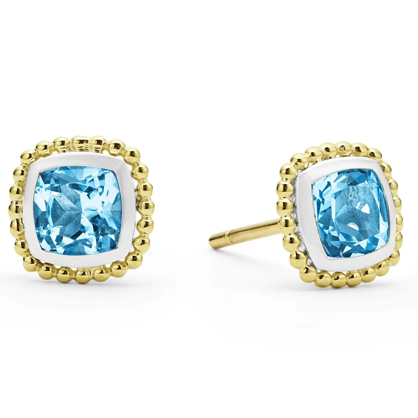 Swiss Blue Topaz Gemstone Stud Earrings Surrounded By Smooth Sterling Silver And 18K Gold Caviar Beading.