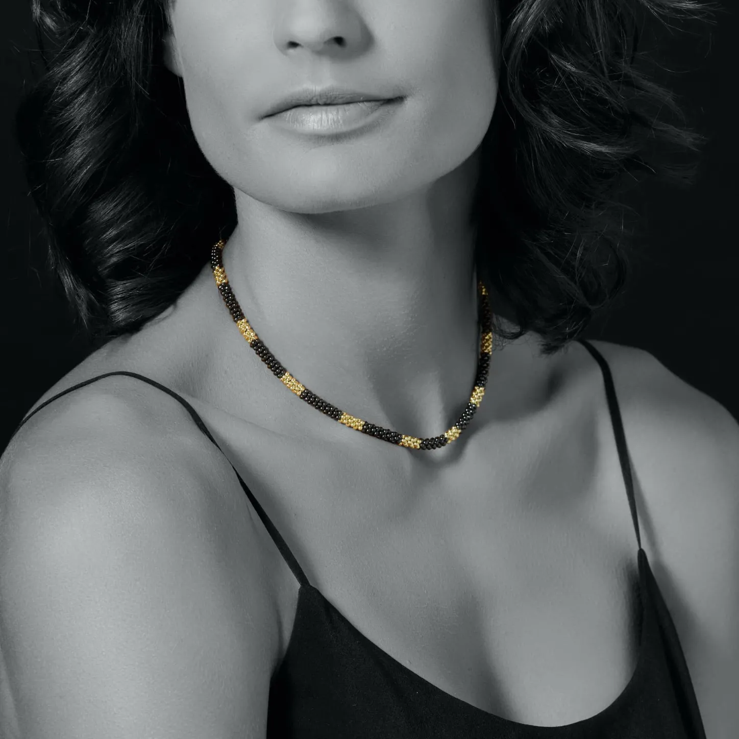 Twelve Medium 18K Gold Stations Highlighted By Black Ceramic Caviar Beading On This Necklace Finished With An 18K Gold Lobster Clasp.