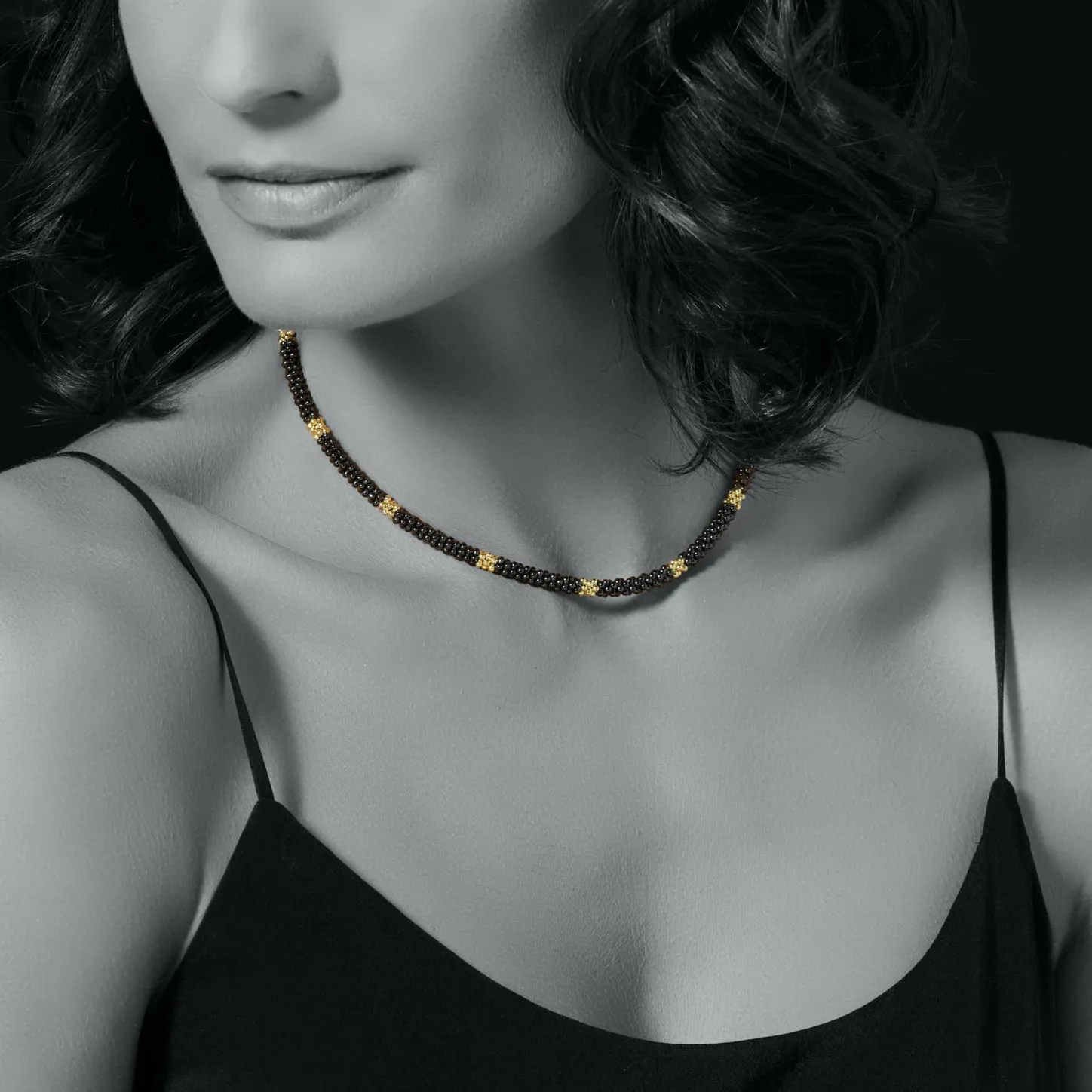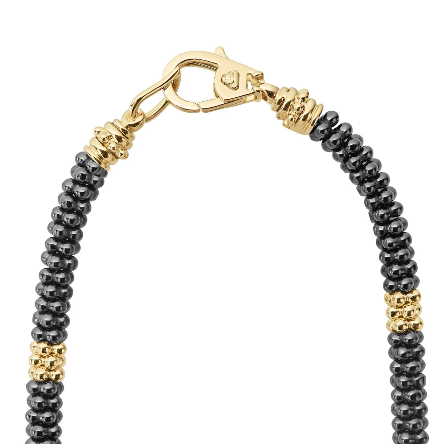 Twelve Small 18K Gold Stations Highlighted By Black Ceramic Caviar Beading On This Necklace Finished With An 18K Gold Lobster Clasp.