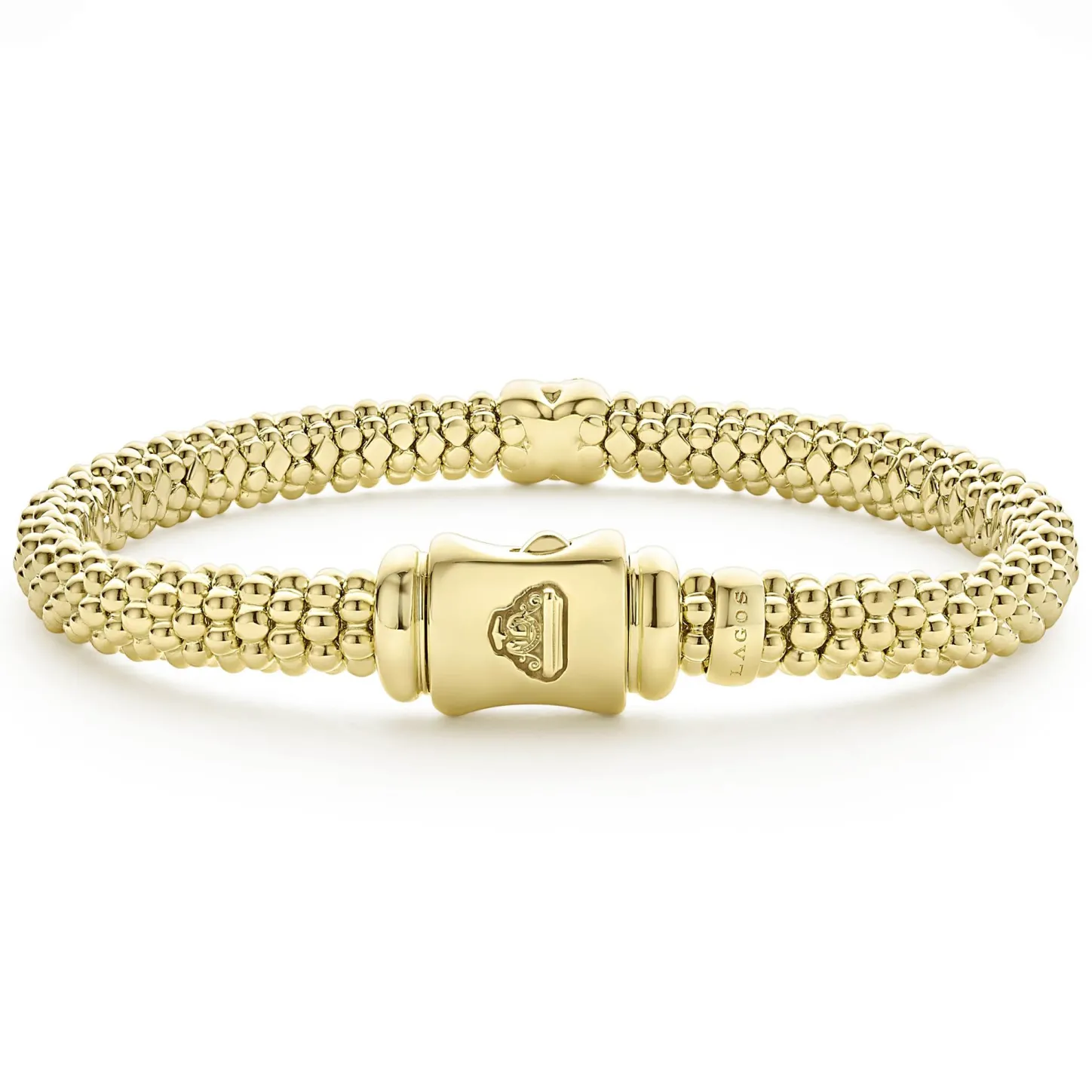 An 18K Gold Diamond X Station Wraps This Caviar Beaded Bracelet. Lagos Diamonds Are The Highest Quality Natural Stones.