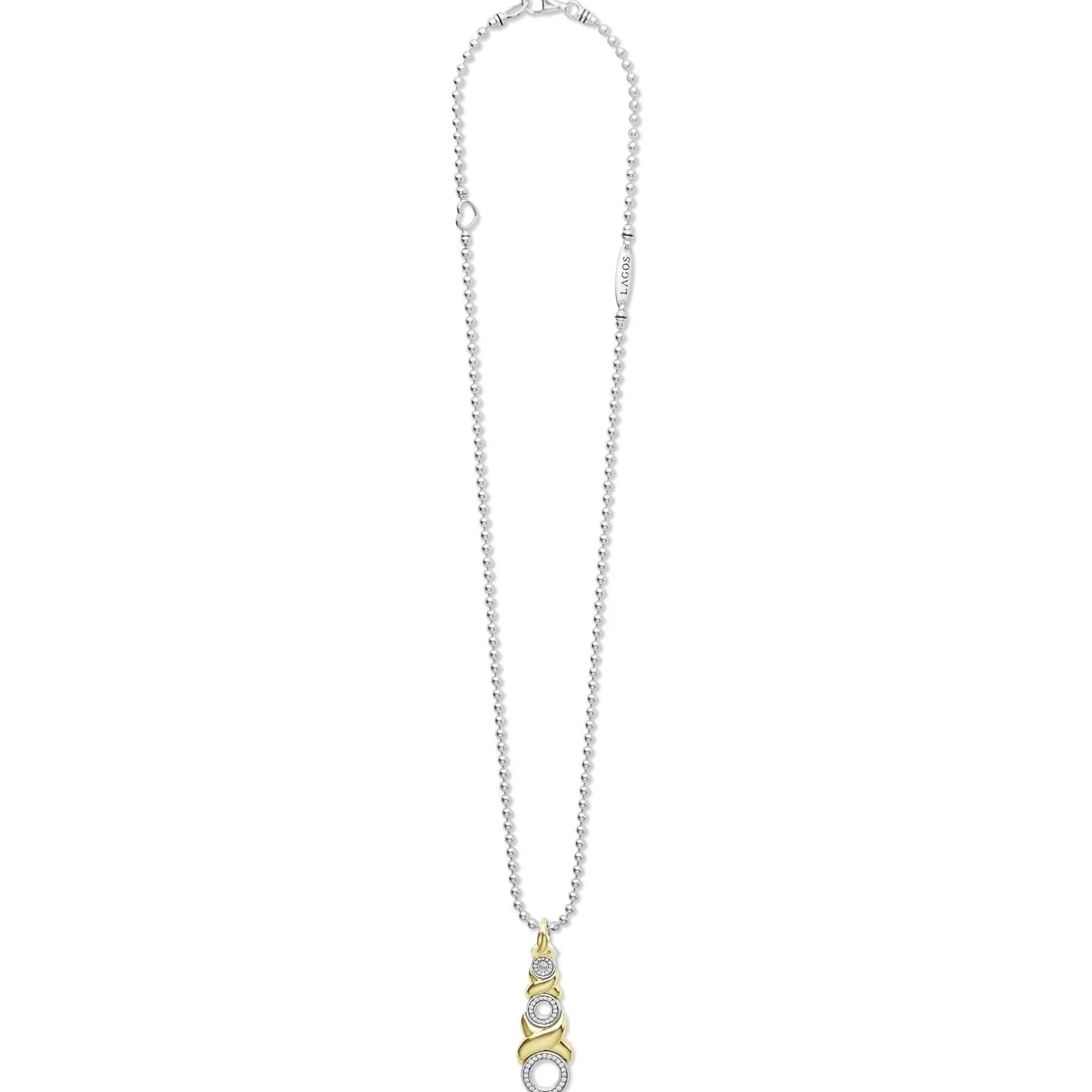Diamonds Set In Three Sterling Silver Graduated Circle Motifs Surrounded By Smooth 18K Gold Form This Pendant Necklace. Finished On A Sterling Silver Ball Chain. Lagos Diamonds Are The Highest Quality Natural Stones.