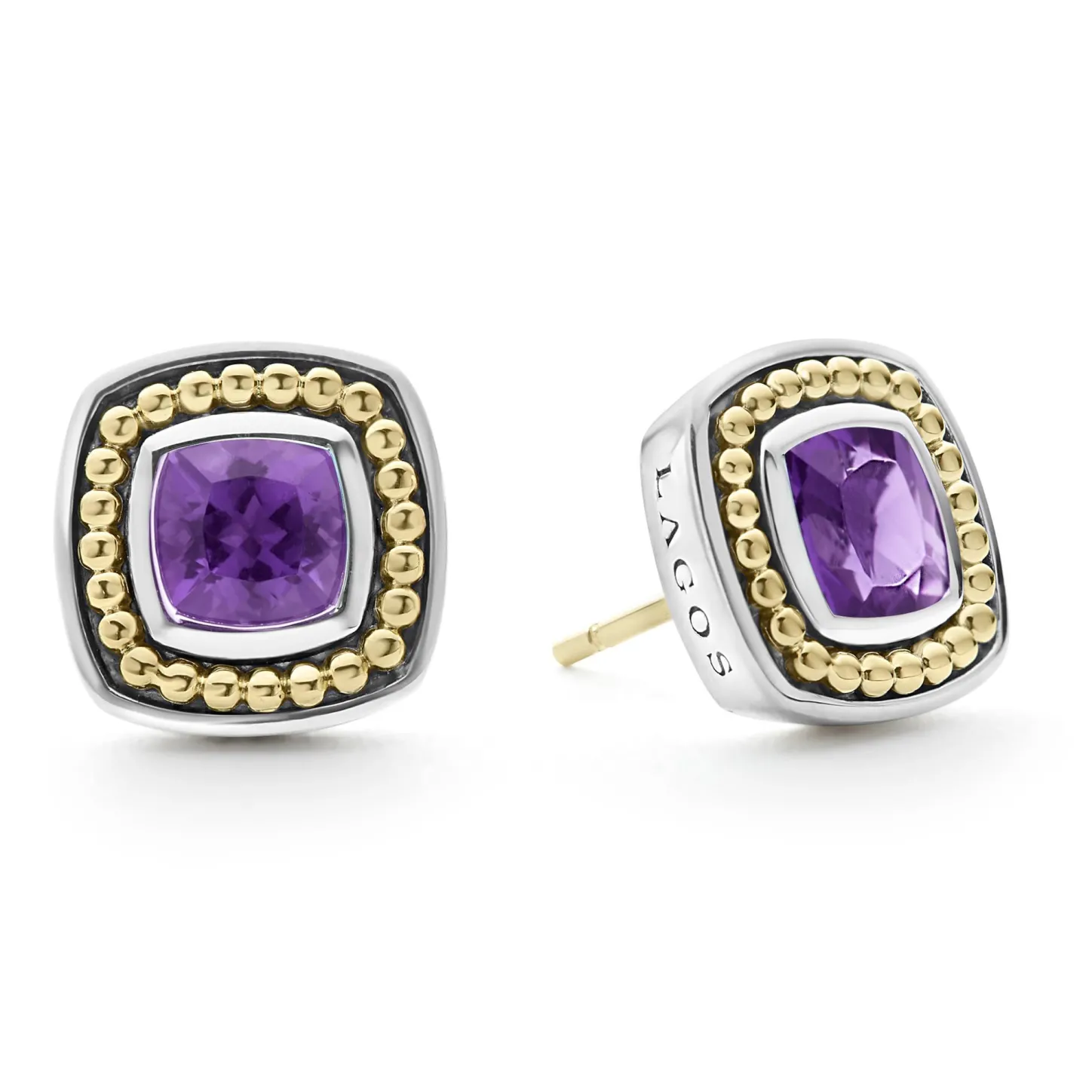 A Lagos Exclusive. Amethyst Gemstone Stud Earrings Surrounded By Sterling Silver And 18K Gold Caviar Beading.
