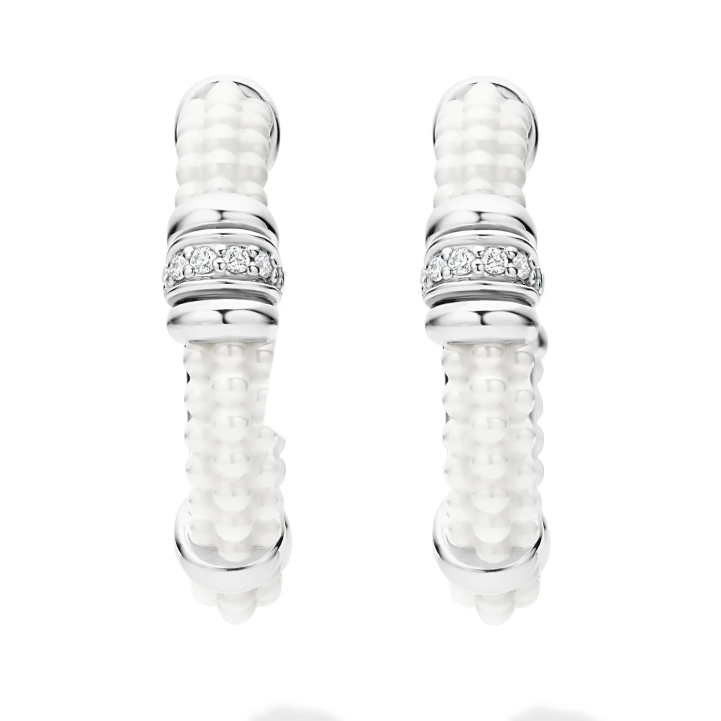 A Lagos Exclusive. White Ceramic Caviar Beading, Sterling Silver And Diamonds Form These Hoop Earrings. Lagos Diamonds Are The Highest Quality Natural Stones.