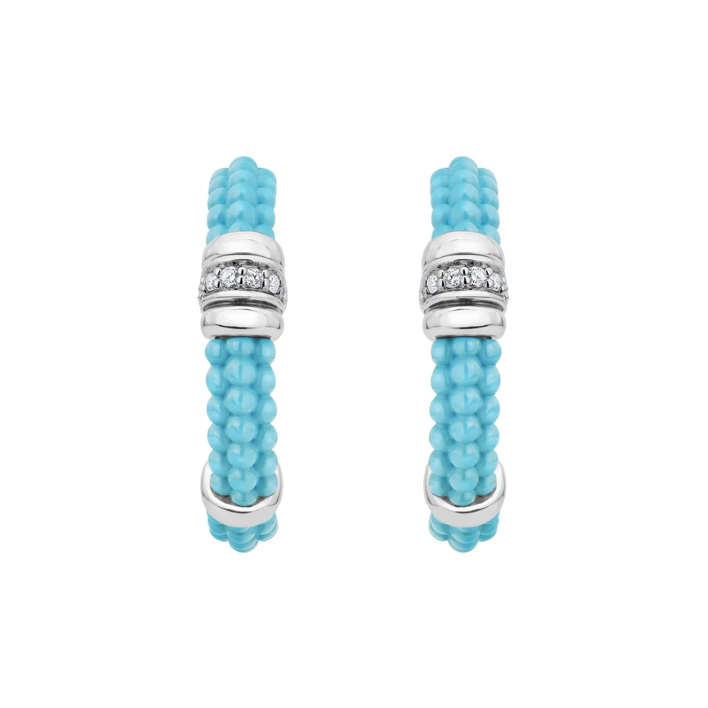 Blue Ceramic Caviar Beading, Sterling Silver And Diamonds Form These Hoop Earrings. Lagos Diamonds Are The Highest Quality Natural Stones.