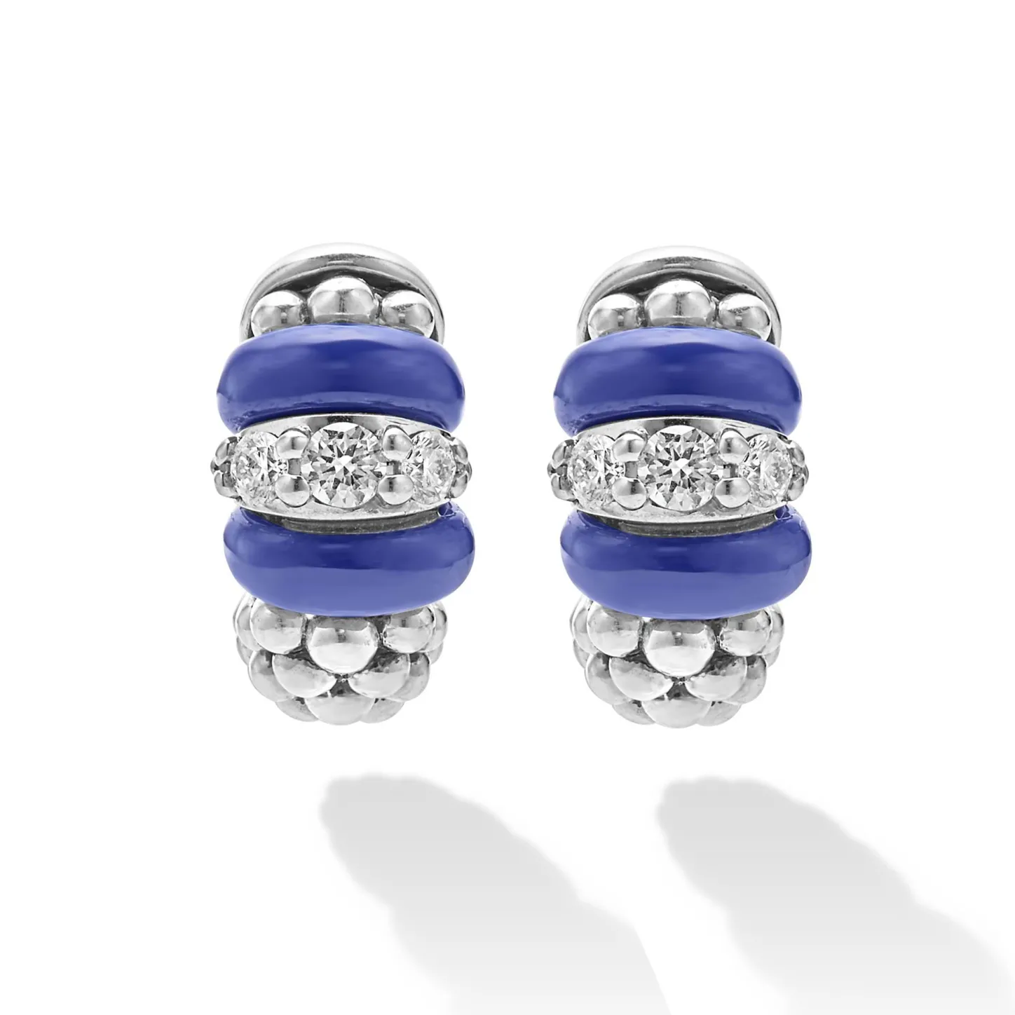 Smooth Ultramarine Ceramic & Diamonds With Caviar Beading Form These Huggie Hoop Earrings. Lagos Diamonds Are The Highest Quality Natural Stones.