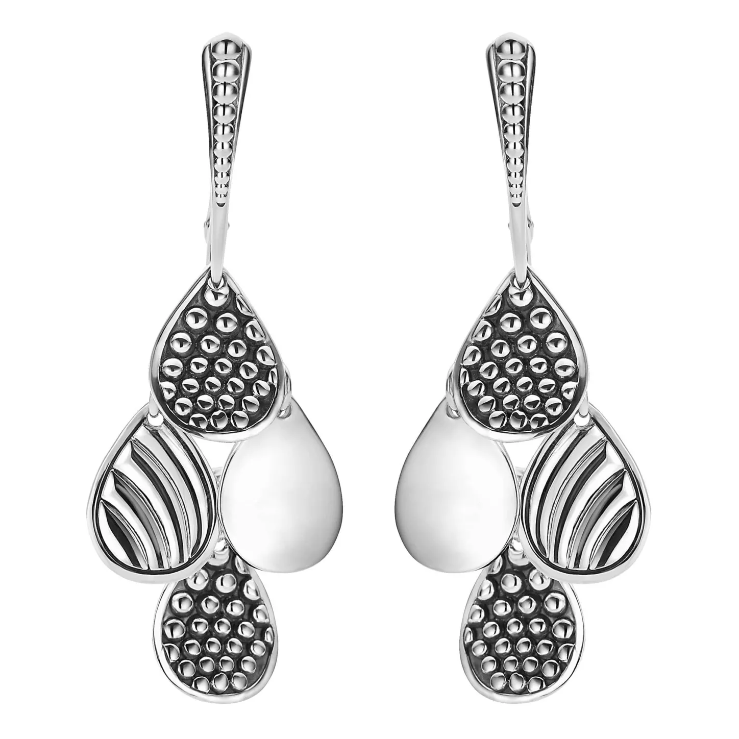 Teardrop Shapes Of Smooth Sterling Silver, Caviar Beading, And Fluted Sterling Silver On These Lightweight Drop Earrings.