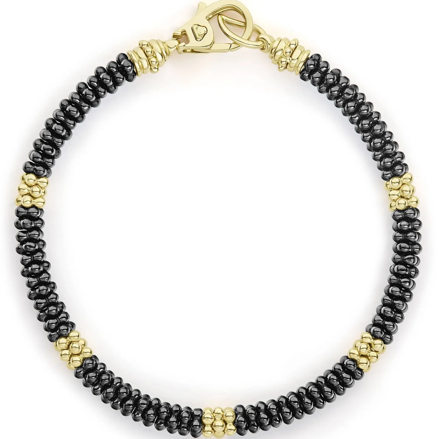 Five Medium Gold Bead Stations Highlighted By Black Ceramic Caviar Beading Form This Signature Bracelet.