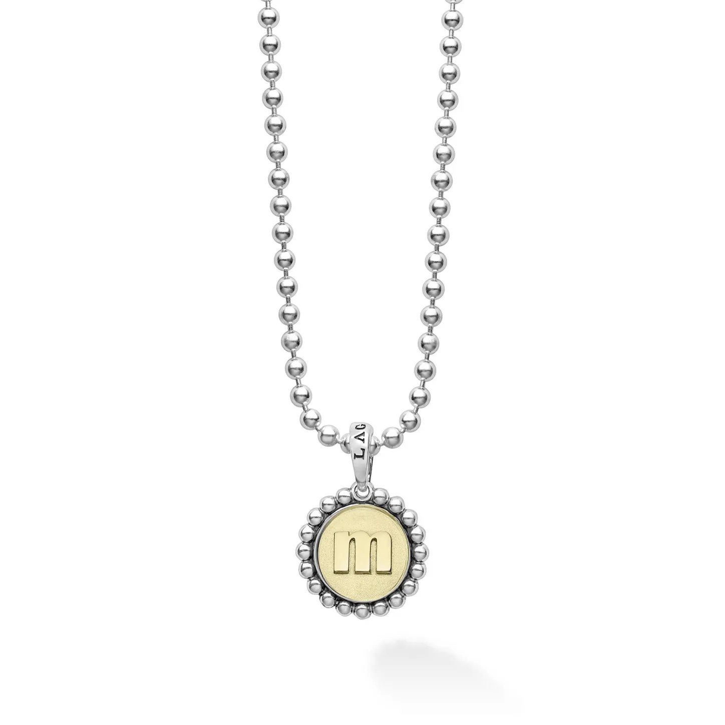 Our Signature Caviar Sterling Silver And 18K Gold Initial ‘M’ Charm Finished On A Sterling Silver Ball Chain Necklace.