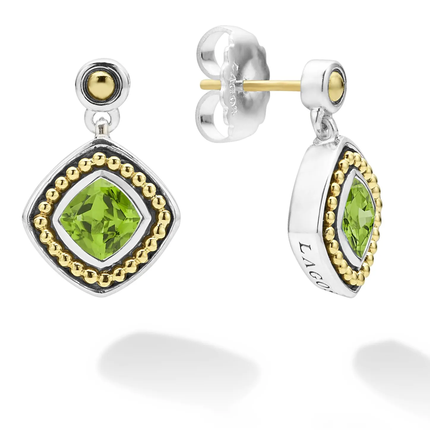 Peridot Gemstone Drop Earrings Surrounded By Sterling Silver And 18K Gold Caviar Beading.