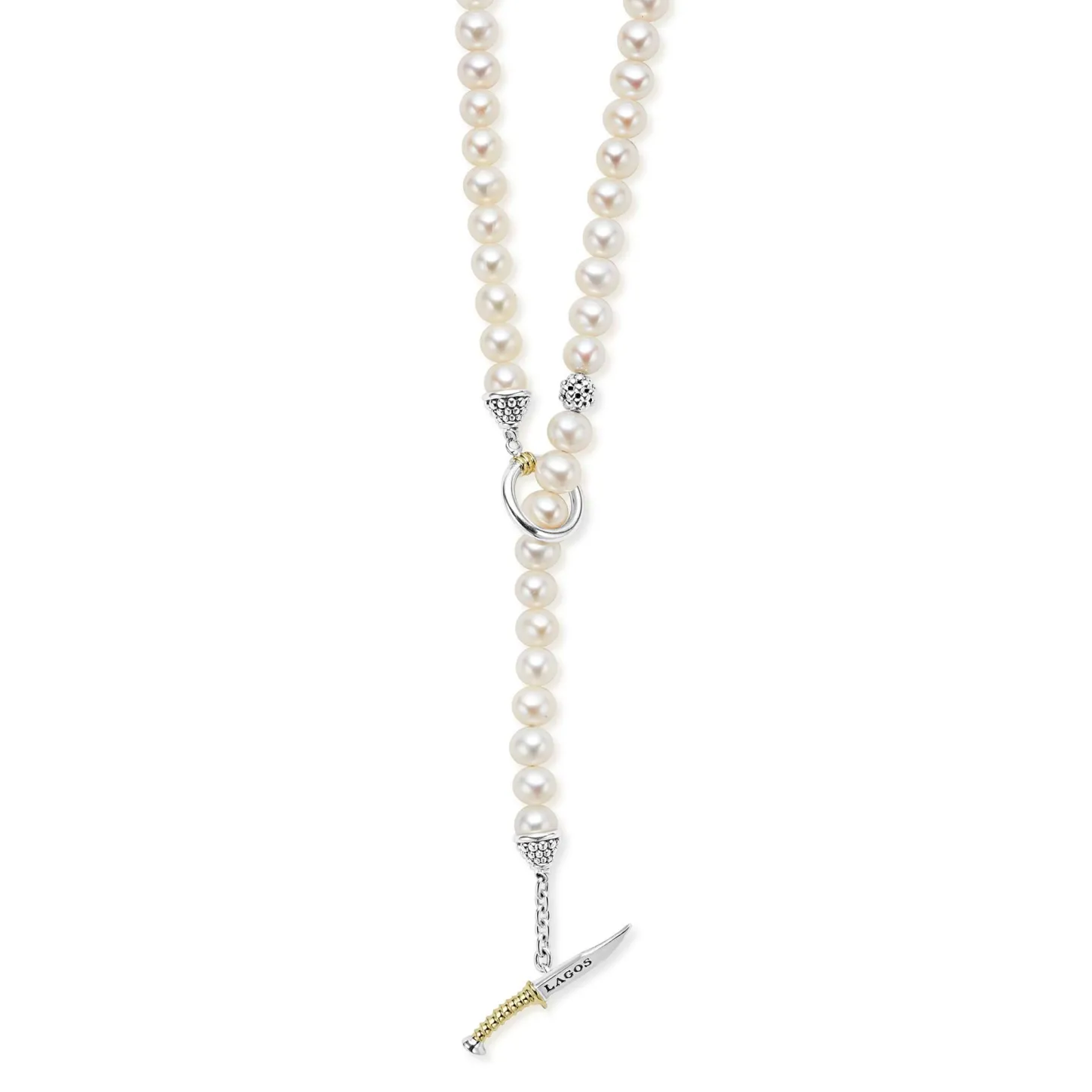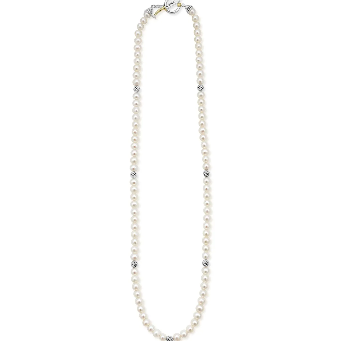 A Freshwater Cultured Pearl Necklace With Sterling Silver Caviar Beaded Accents. Finished On An 18K Gold Dagger Toggle Clasp.