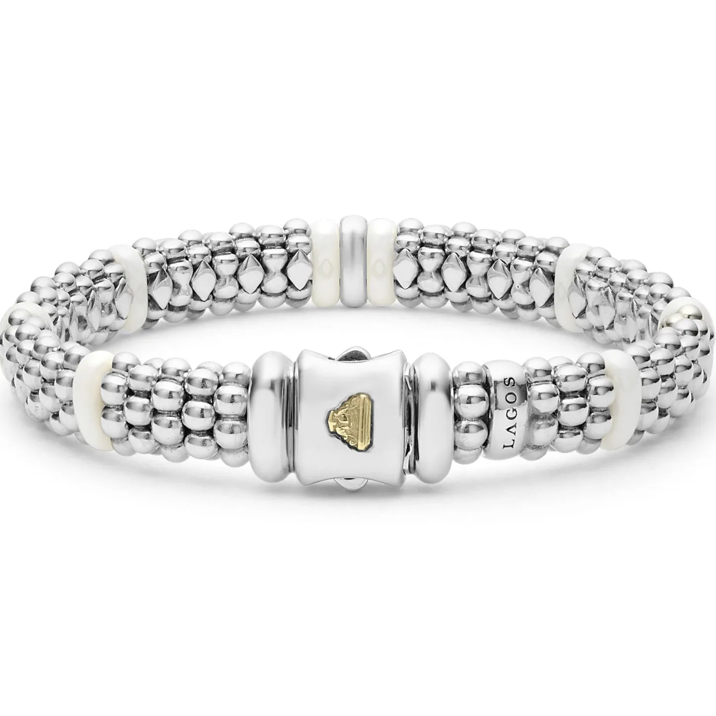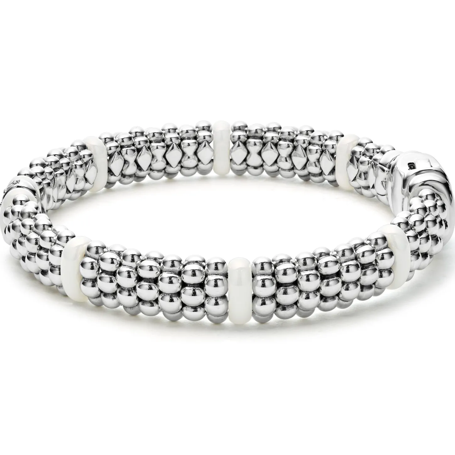 A Lagos Exclusive. A Single Diamond Station Set In Sterling Silver Surrounded By White Ceramic And Caviar Beading. Lagos Diamonds Are The Highest Quality Natural Stones.