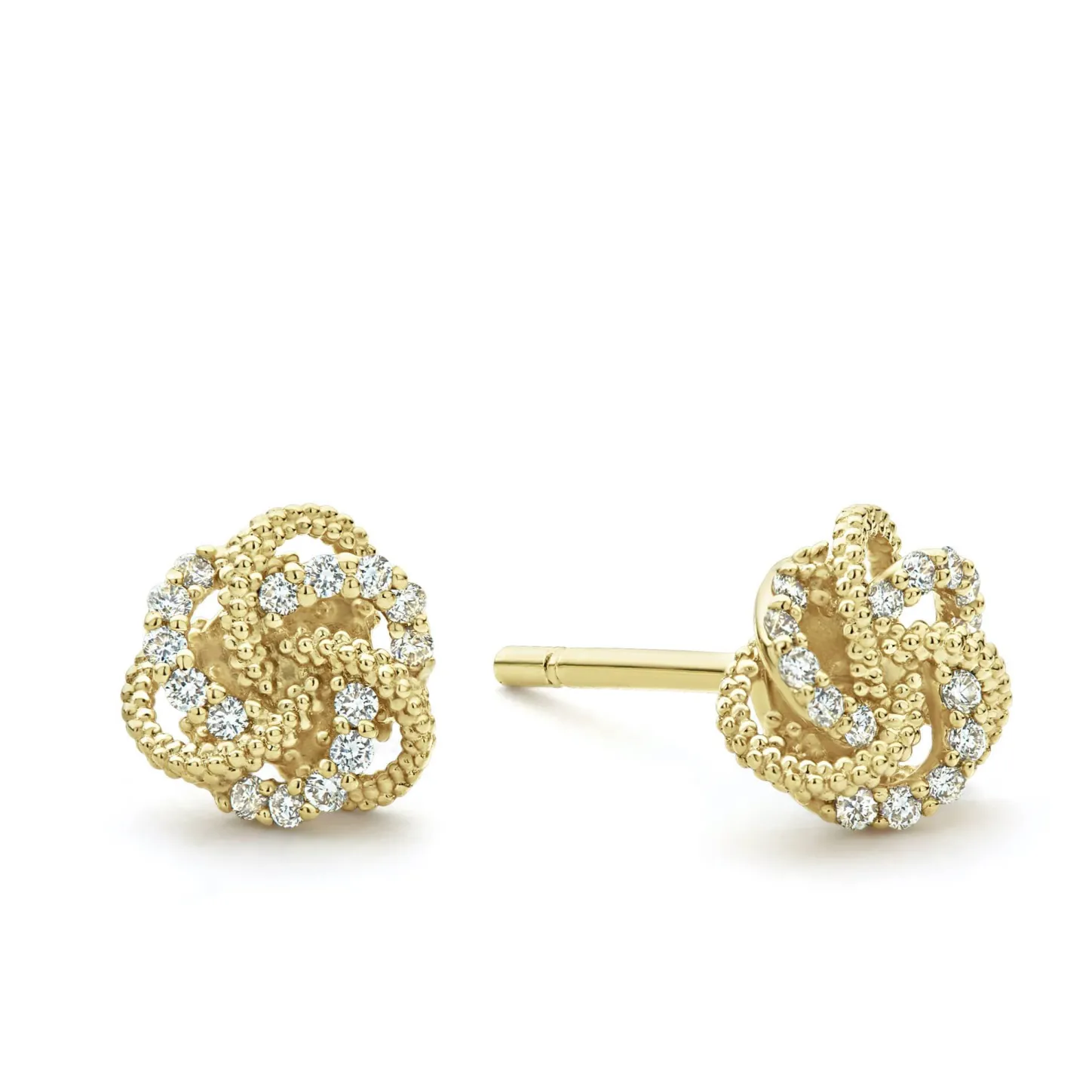 Love Knot Stud Earrings Formed Of Diamonds And 18K Gold Caviar Beaded Bands. Lagos Diamonds Are The Highest Quality Natural Stones.